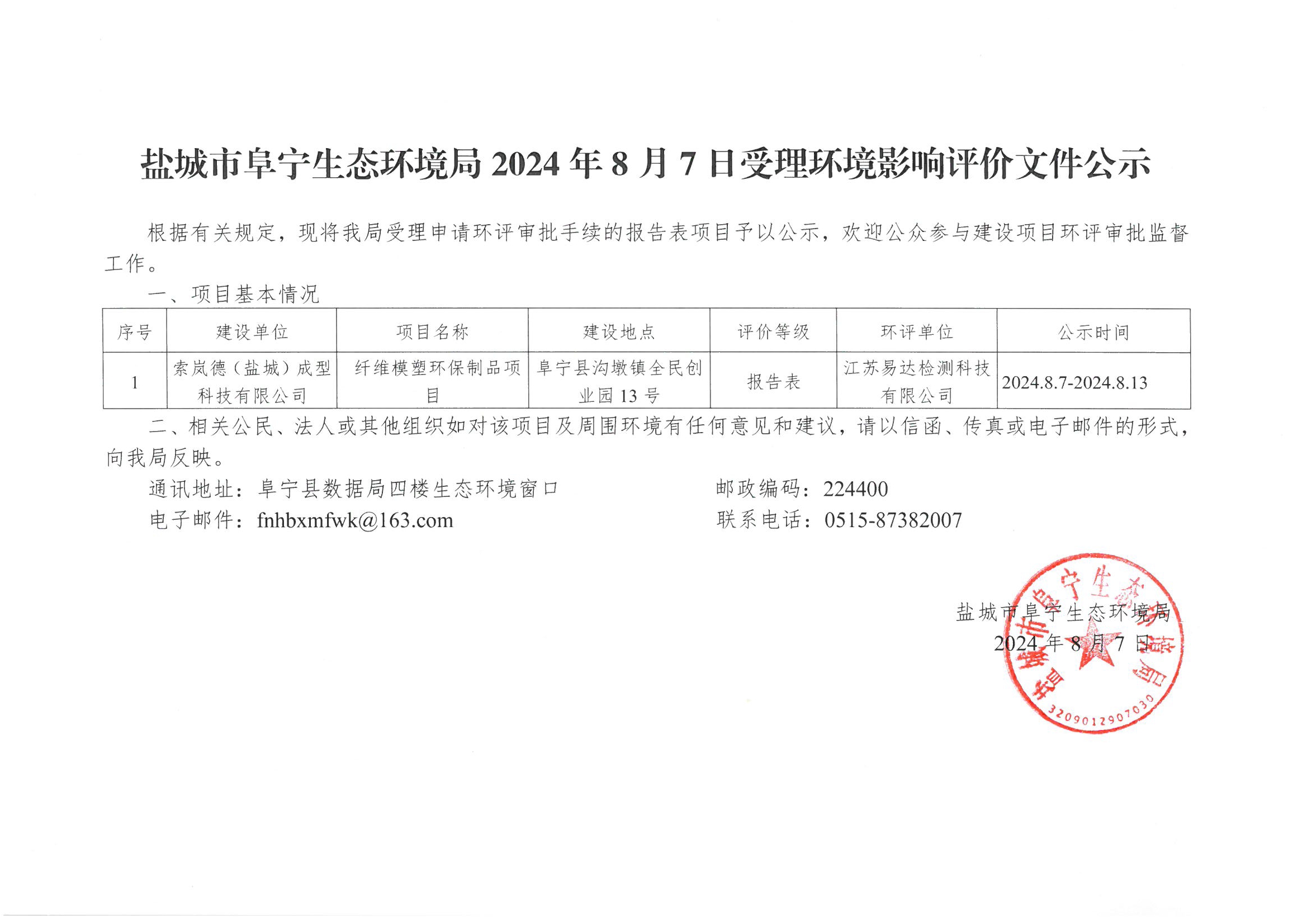 盐城市阜宁生态环境局2024年8月7日受理环境影响评价文件公示