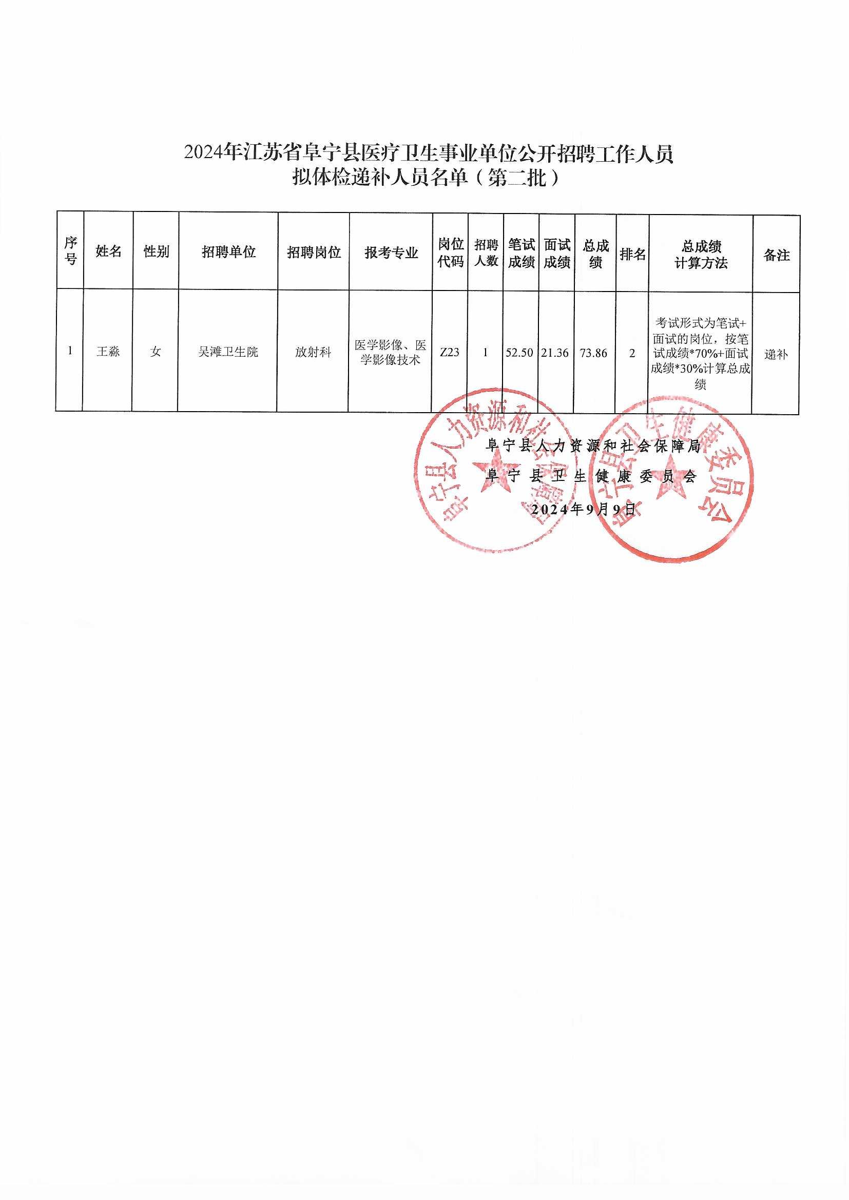 2024年江苏省阜宁县医疗卫生事业单位公开招聘工作人员拟体检递补人员名单(第二批)