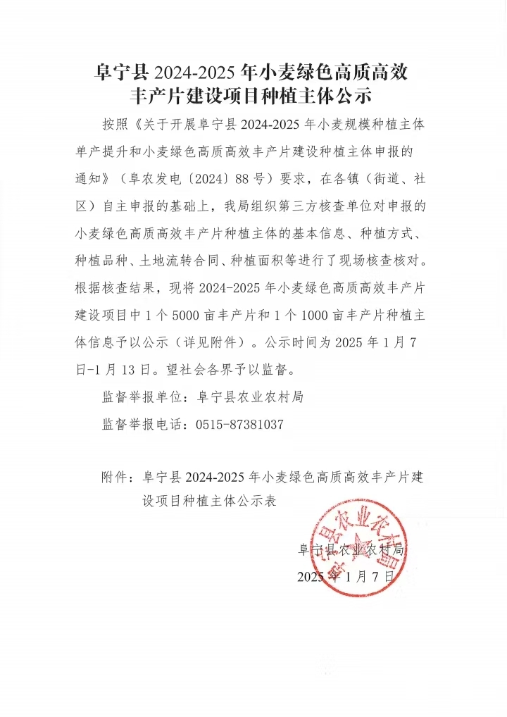 阜宁县2024-2025年小麦绿色高质高效丰产片建设项目种植主体公示