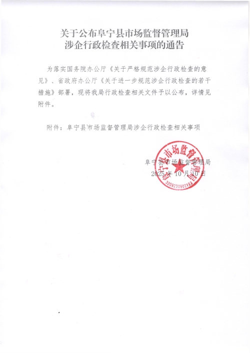 关于公布阜宁县市场监督管理局涉企行政检查相关事项的通告