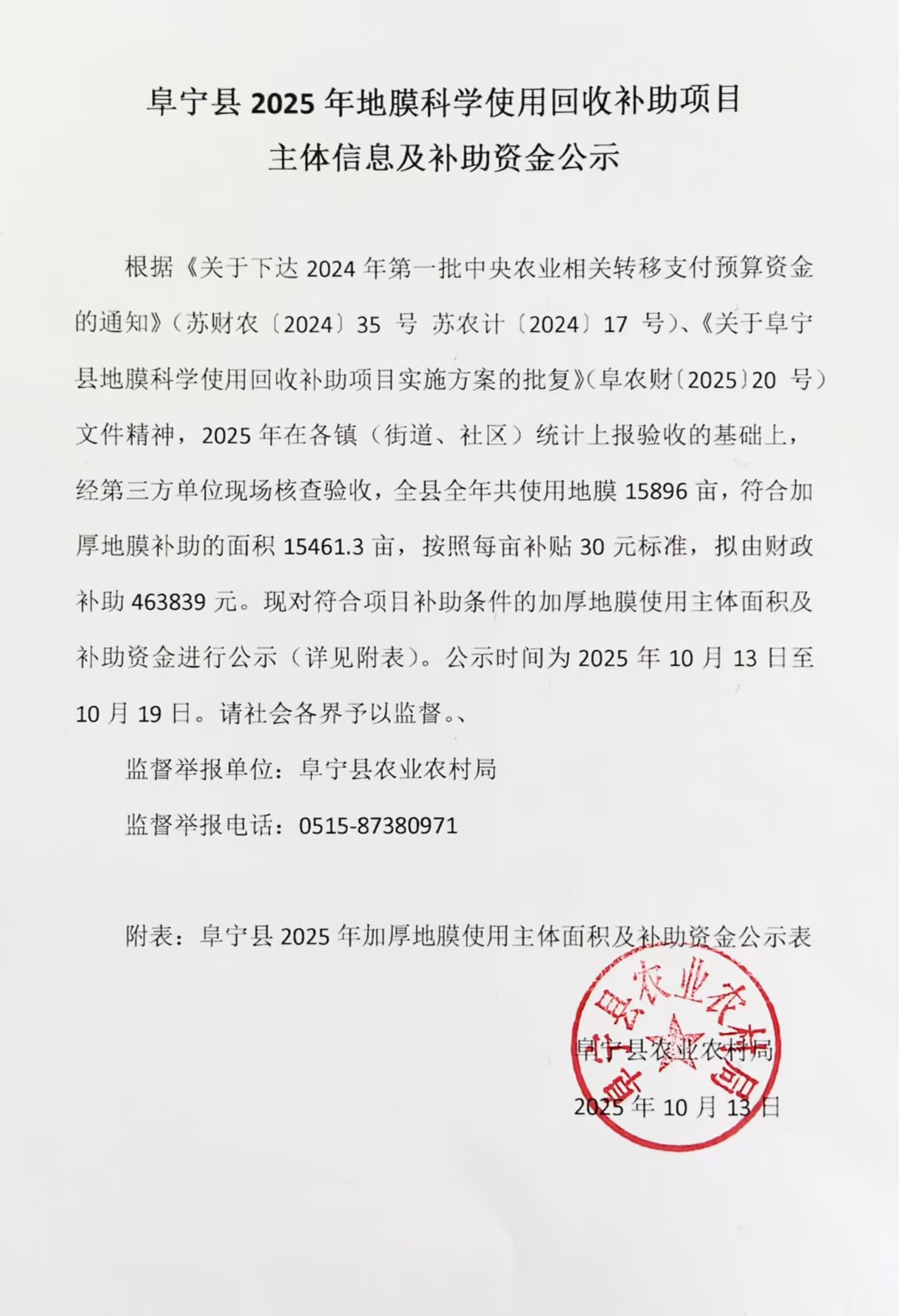 阜宁县2025年地膜科学使用回收补助项目主体信息及补助资金公示