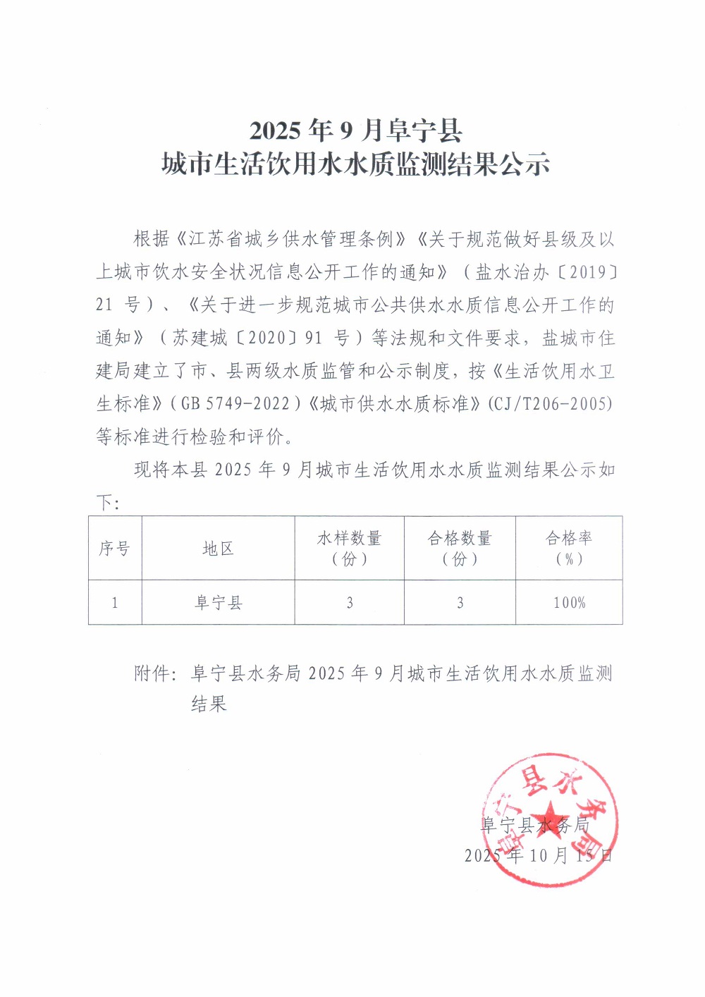 2025年9月阜宁县城市生活饮用水水质监测结果公示