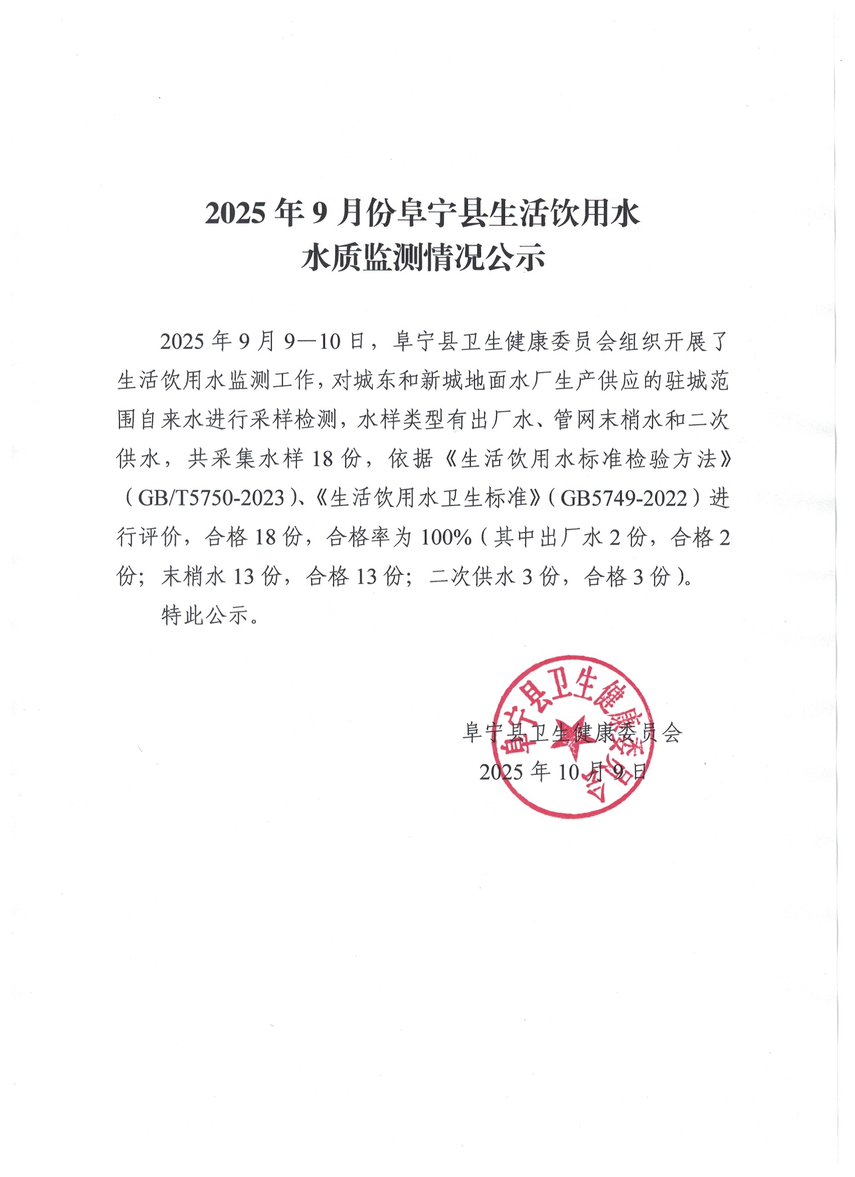 2025年9月份阜宁县生活饮用水