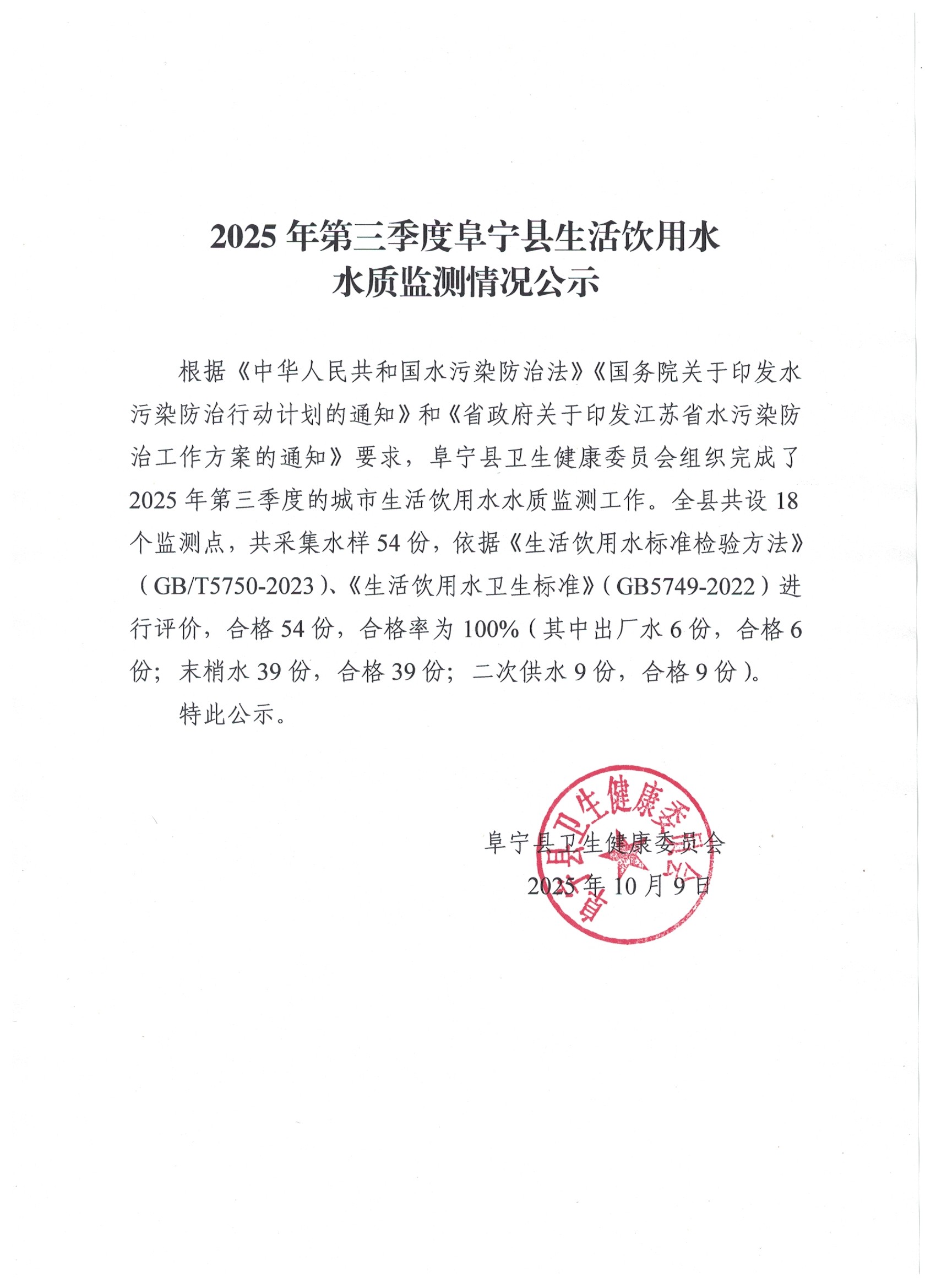 2025年第三季度阜宁县生活饮用水