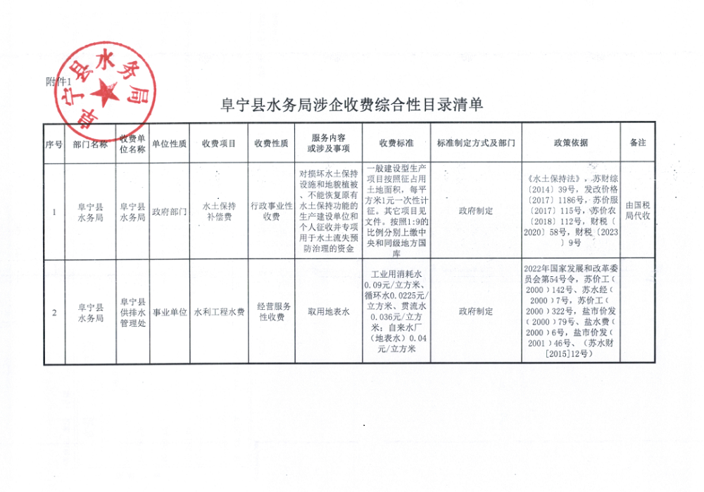 政府部门及下属单位综合性涉企收费目录清单(县水务局)