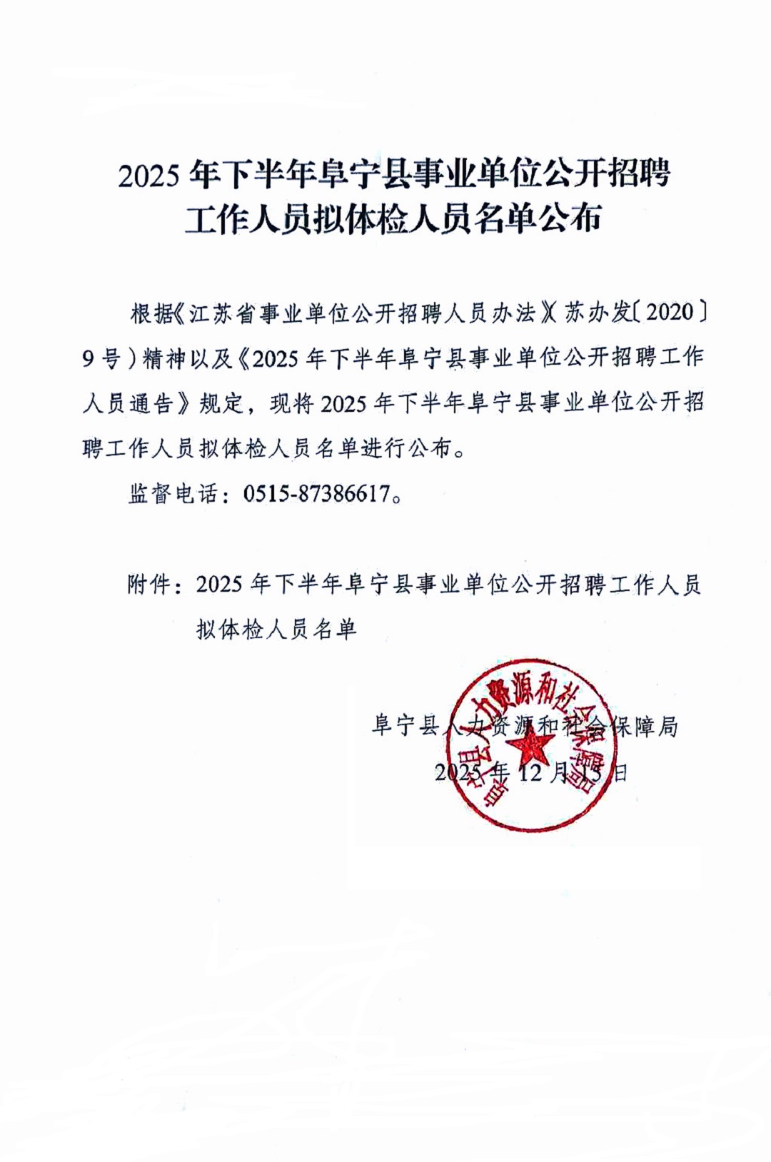 2025年下半年阜宁县事业单位公开招聘工作人员拟体检人员名单公布