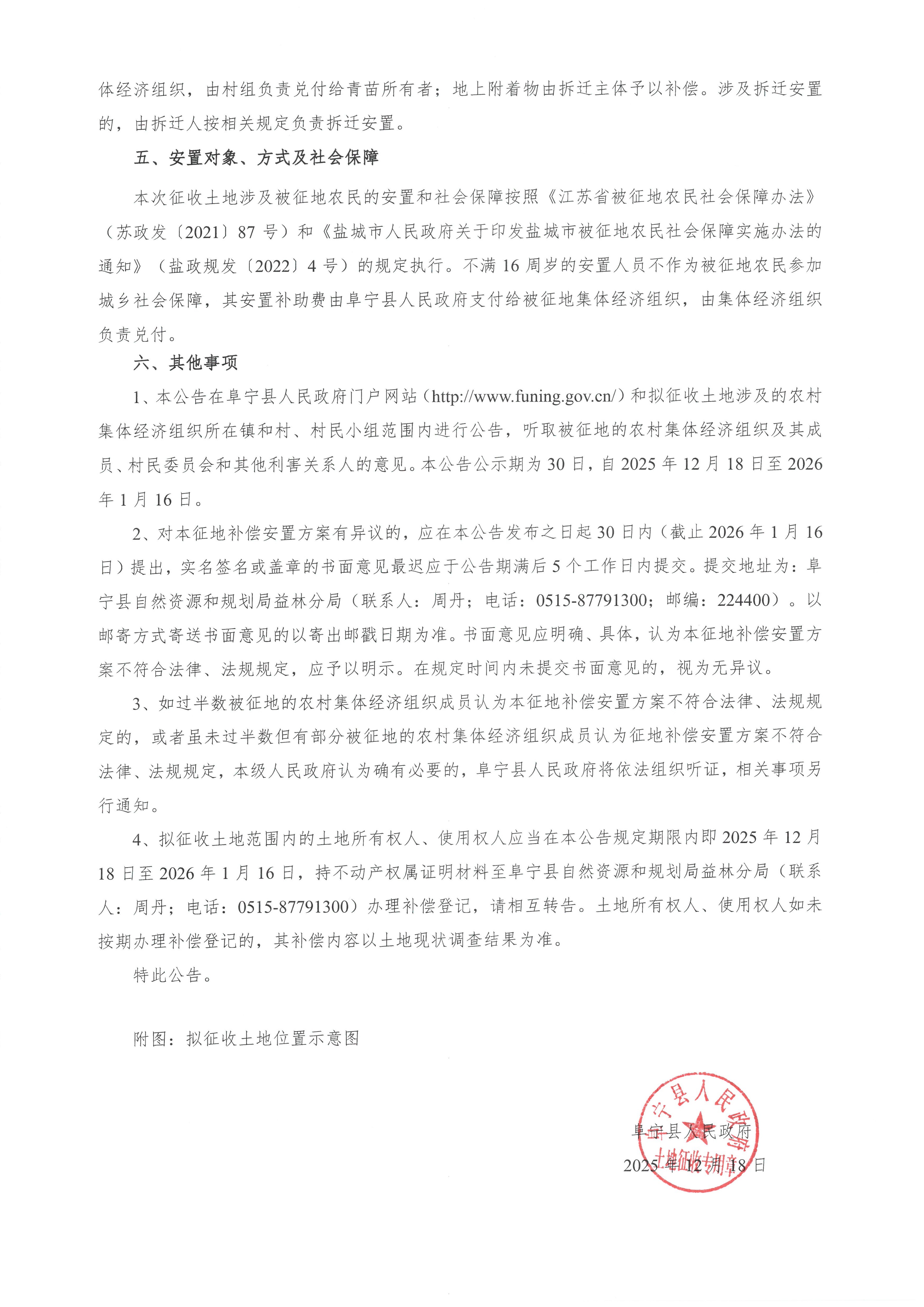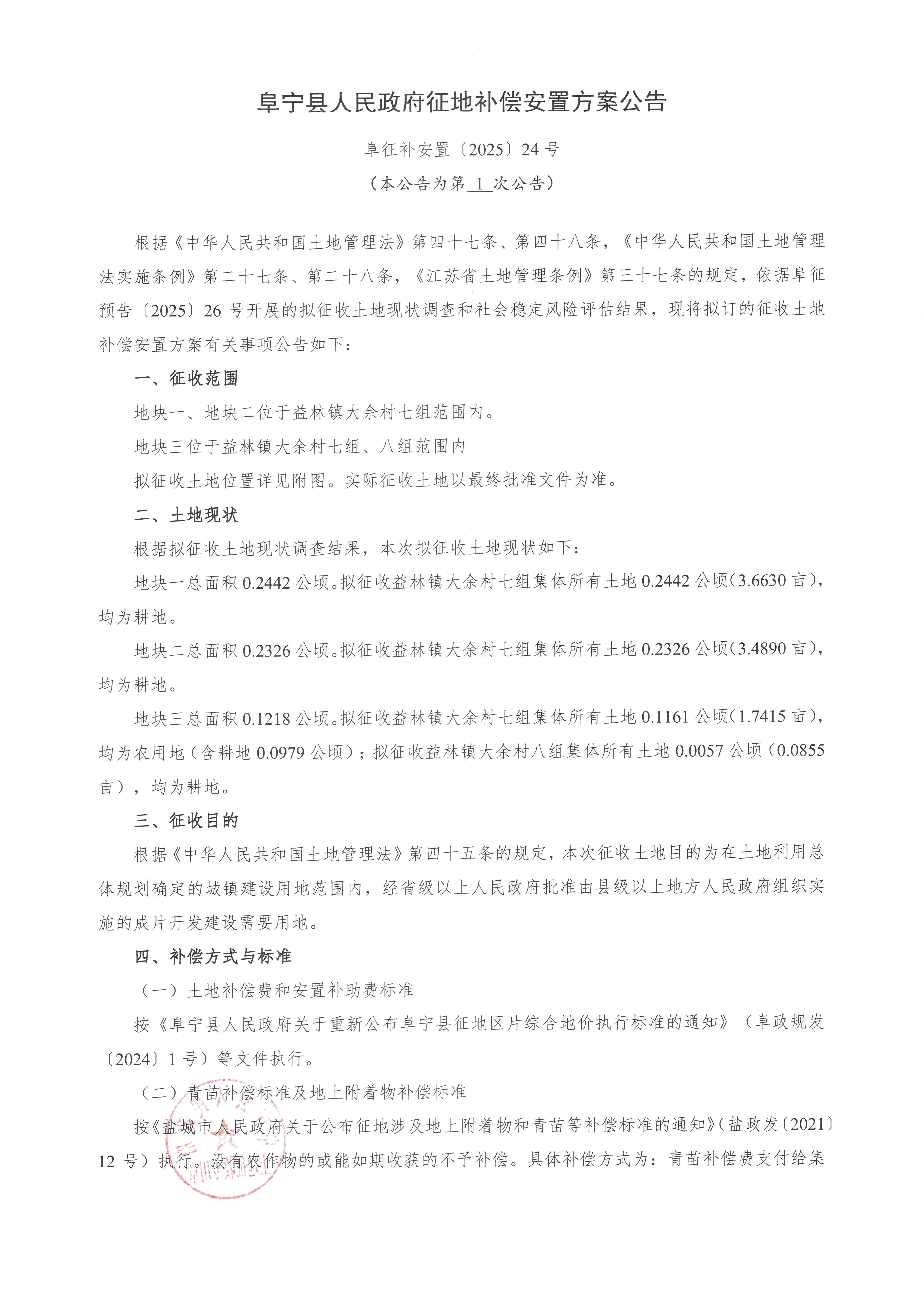 阜宁县人民政府征地补偿安置方案公告(阜征补安置〔2025〕24号)