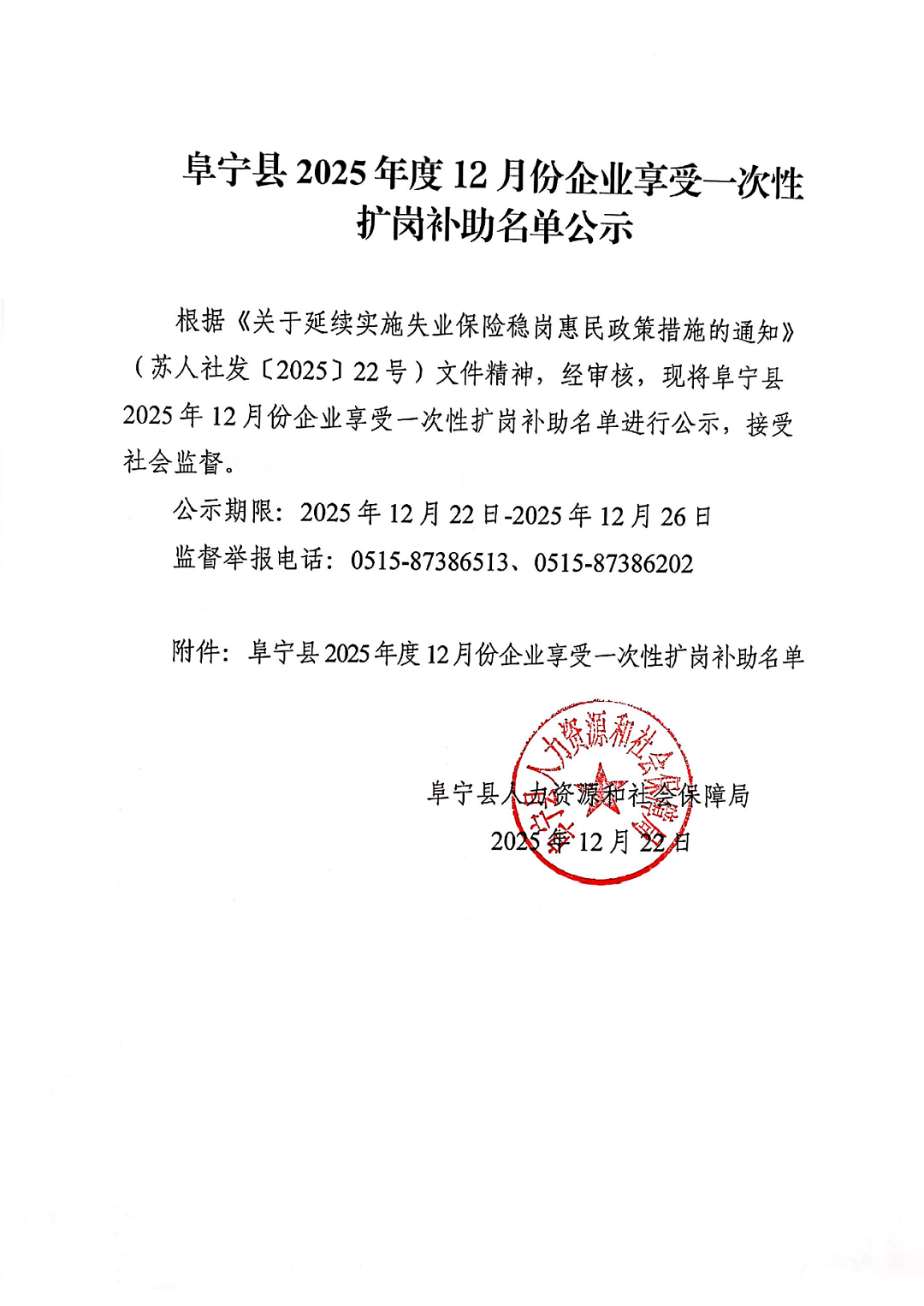 阜宁县2025年度12月份企业享受一次性扩岗补助名单公示