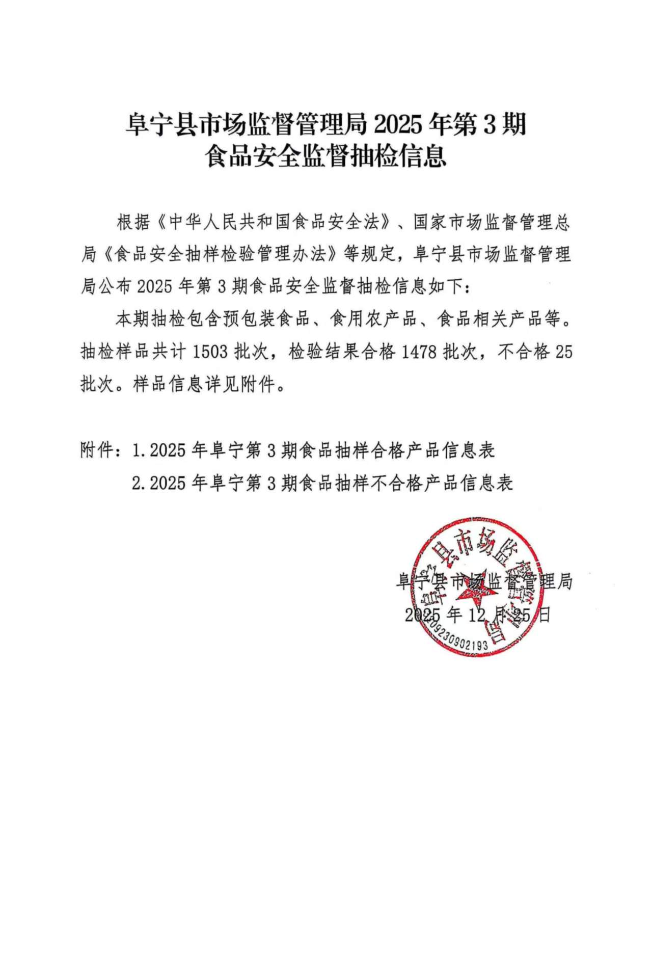 阜宁县市场监督管理局2025年第3期食品安全监督抽检信息公告