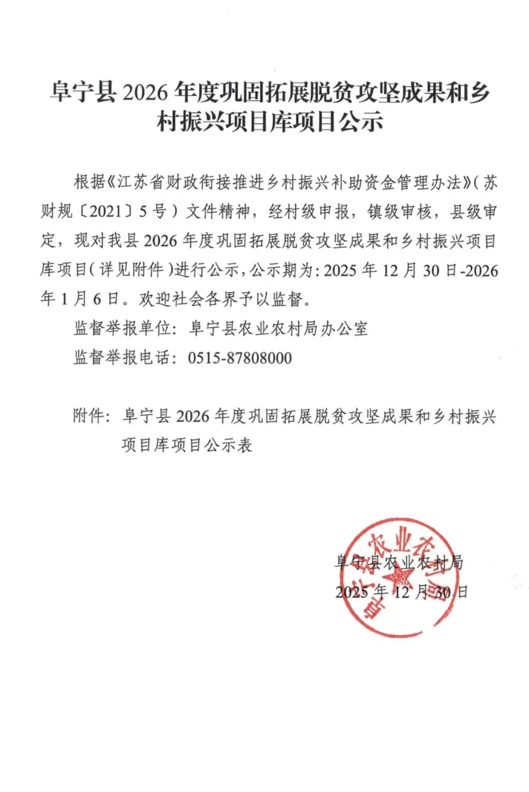 阜宁县2026年度巩固拓展脱贫攻坚成果和乡村振兴项目库项目公示