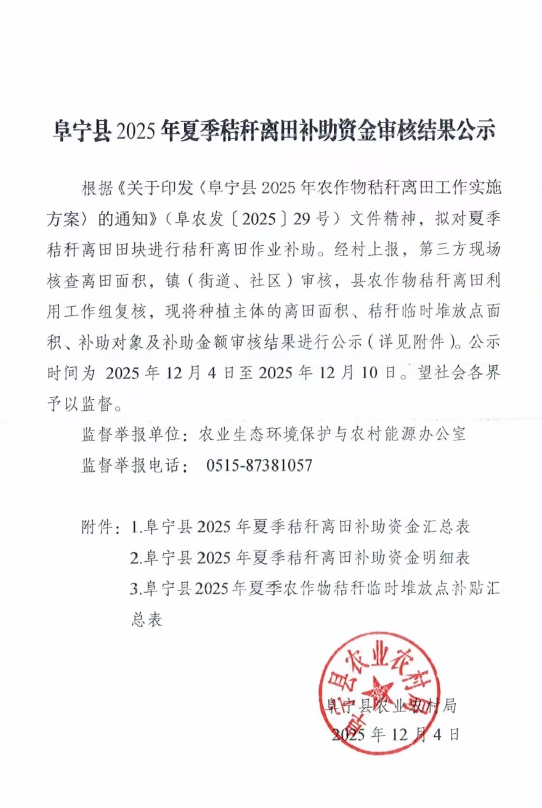 阜宁县2025年夏季秸秆离田补助资金审核结果公示