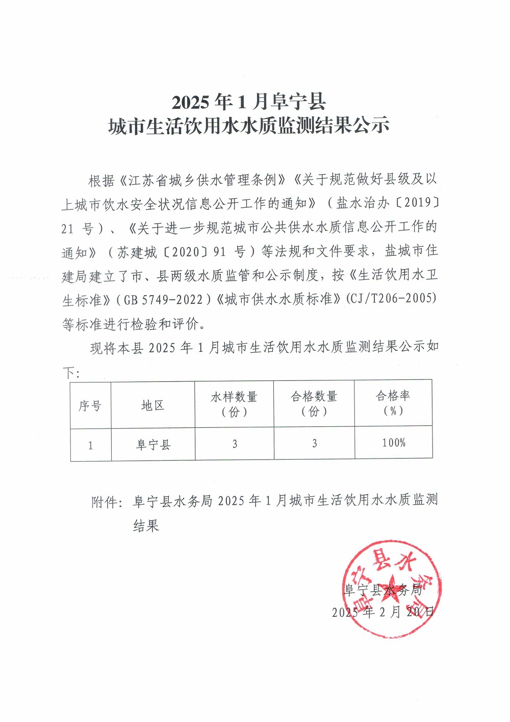 2025年1月阜宁县城市生活饮用水水质监测结果公示