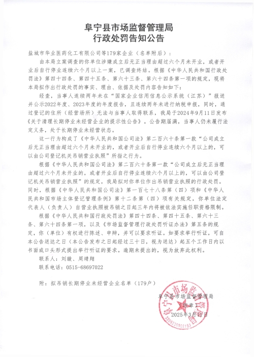 阜宁县市场监督管理局行政处罚告知公告(有限公司)