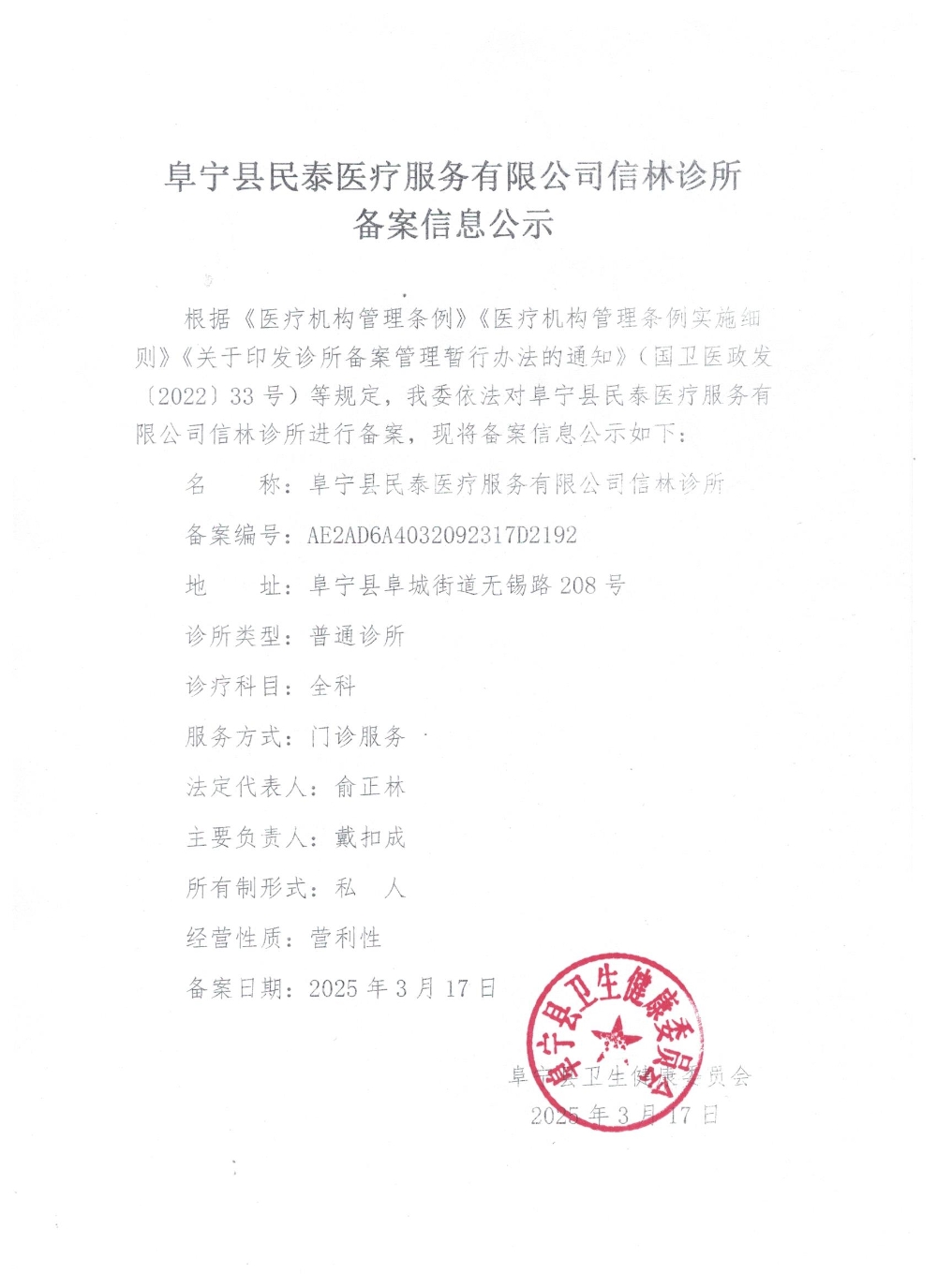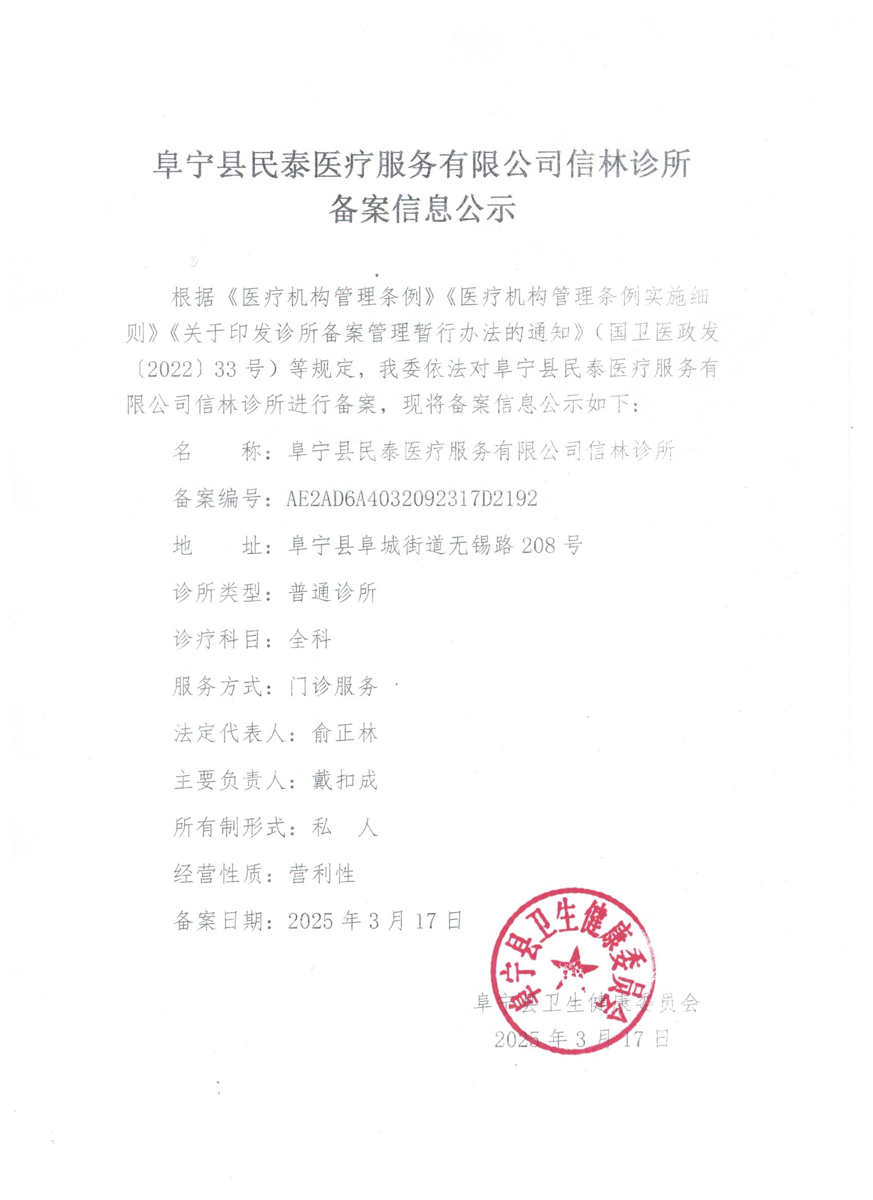 阜宁县民泰医疗服务有限公司信林诊所备案信息公示