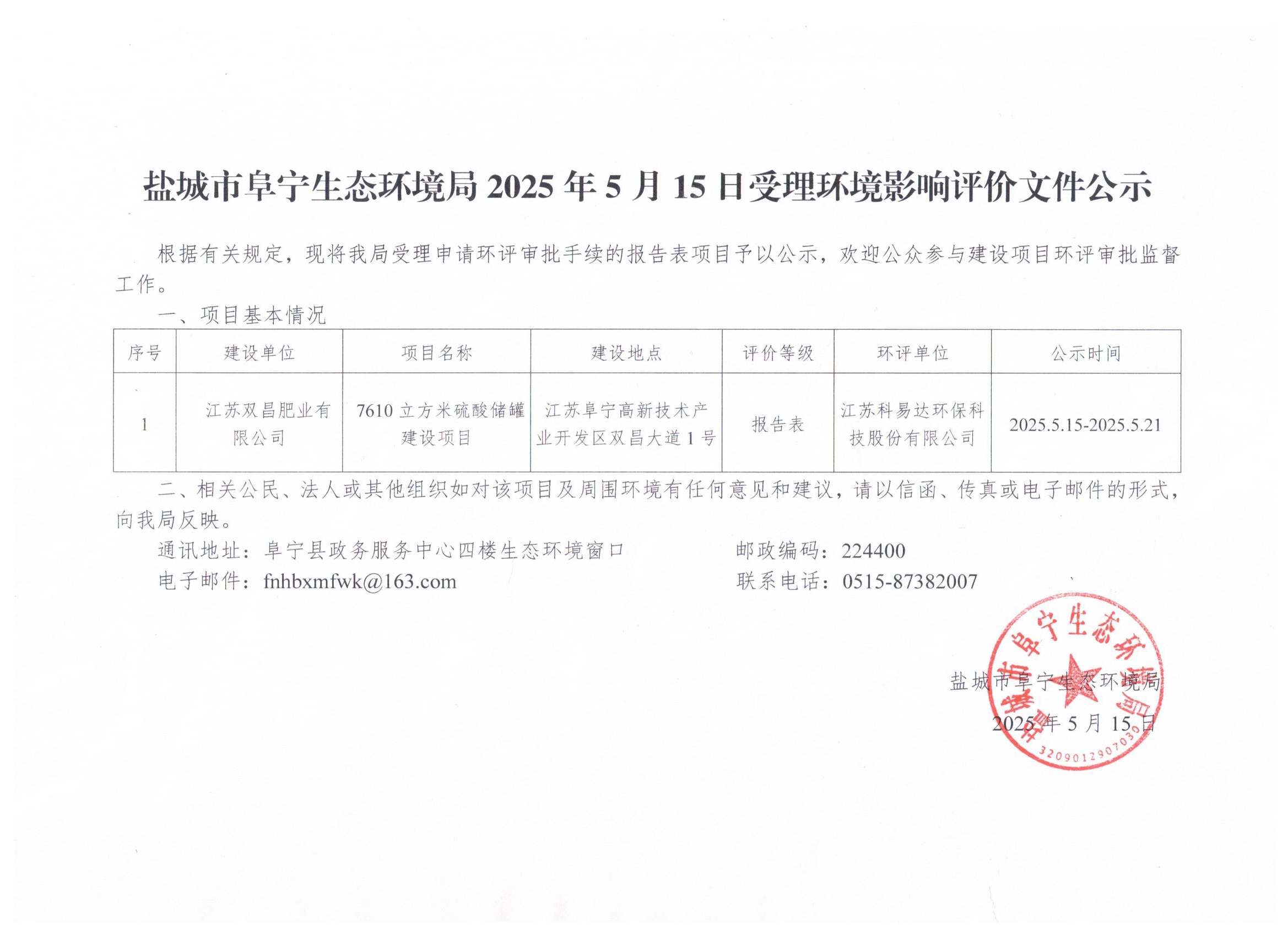 盐城市阜宁生态环境局2025年5月15日受理环境影响评价文件公示