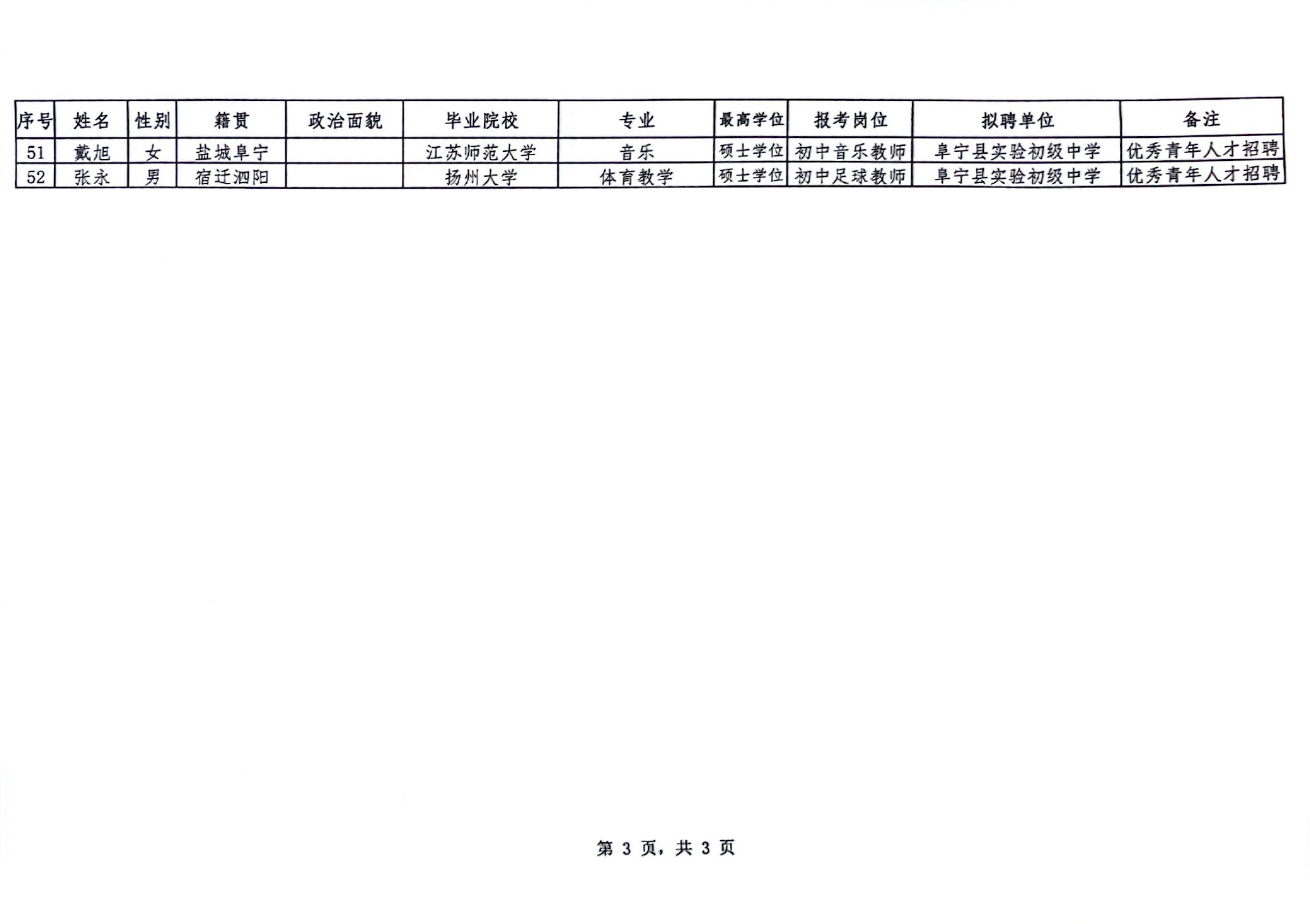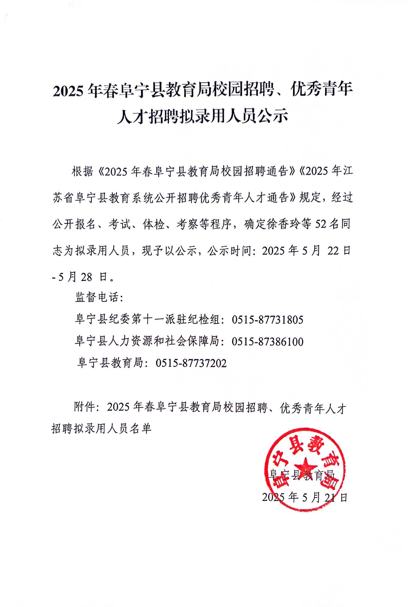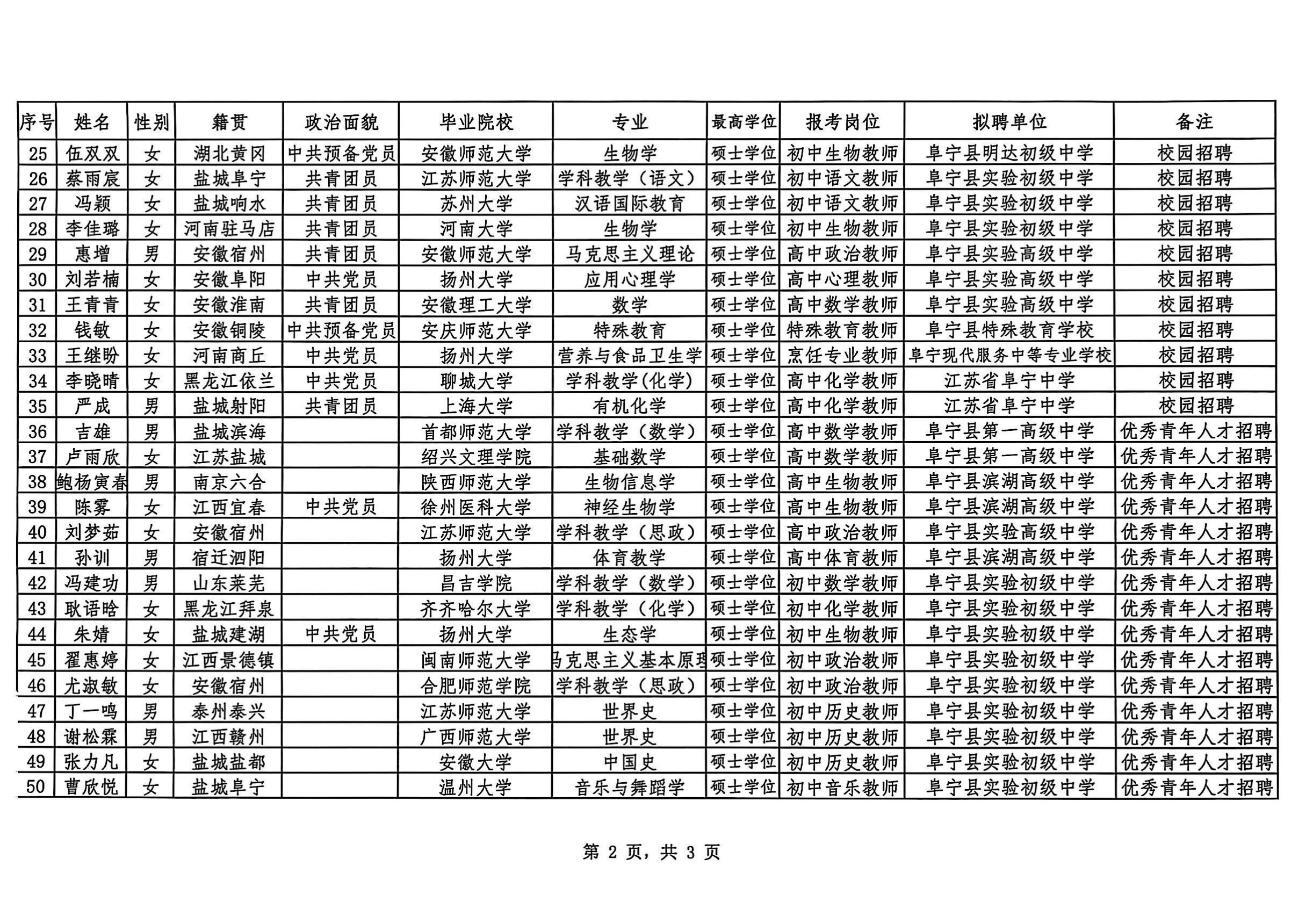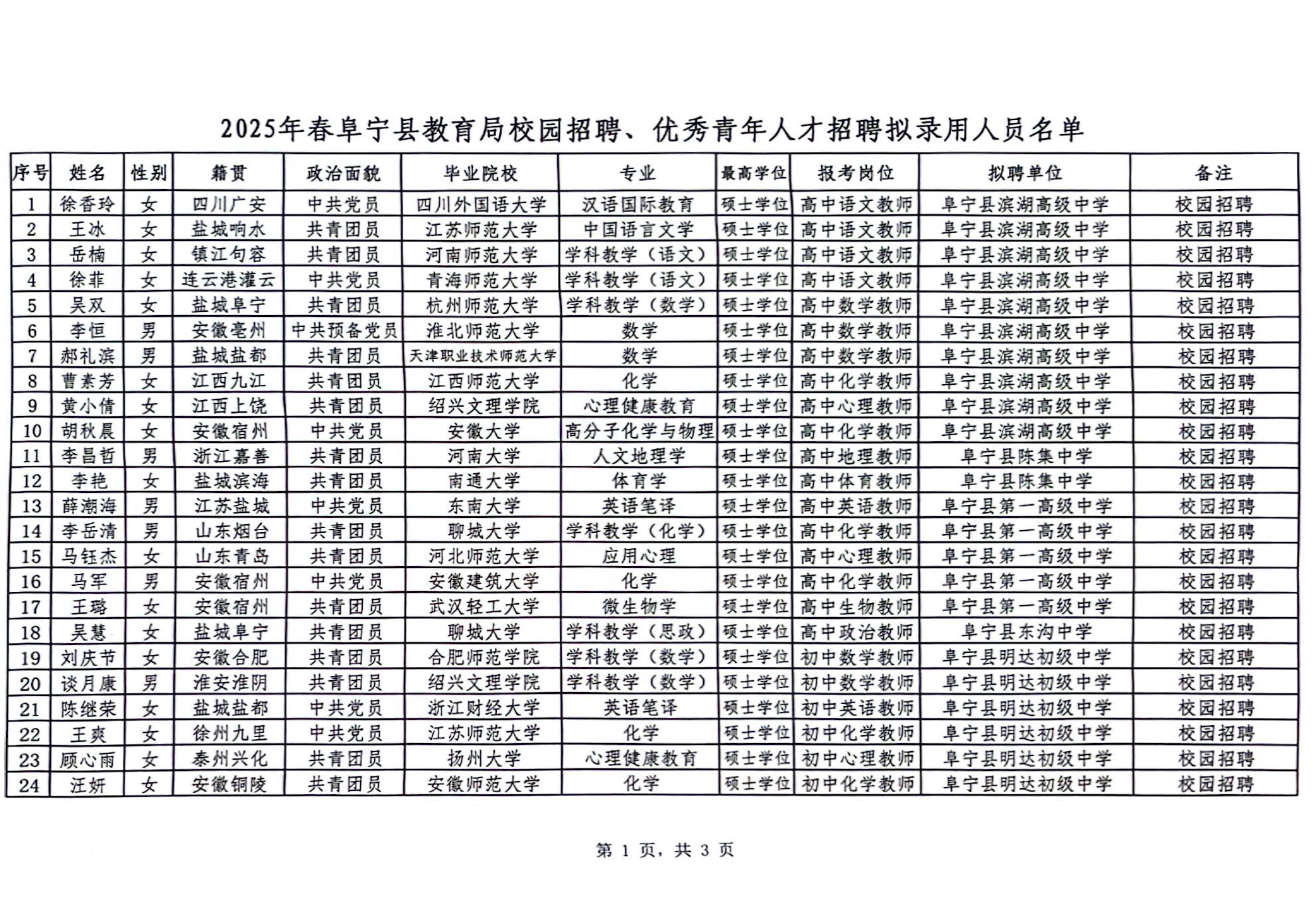 2025年春阜宁县教育局校园招聘、优秀青年人才招聘拟录用人员公示