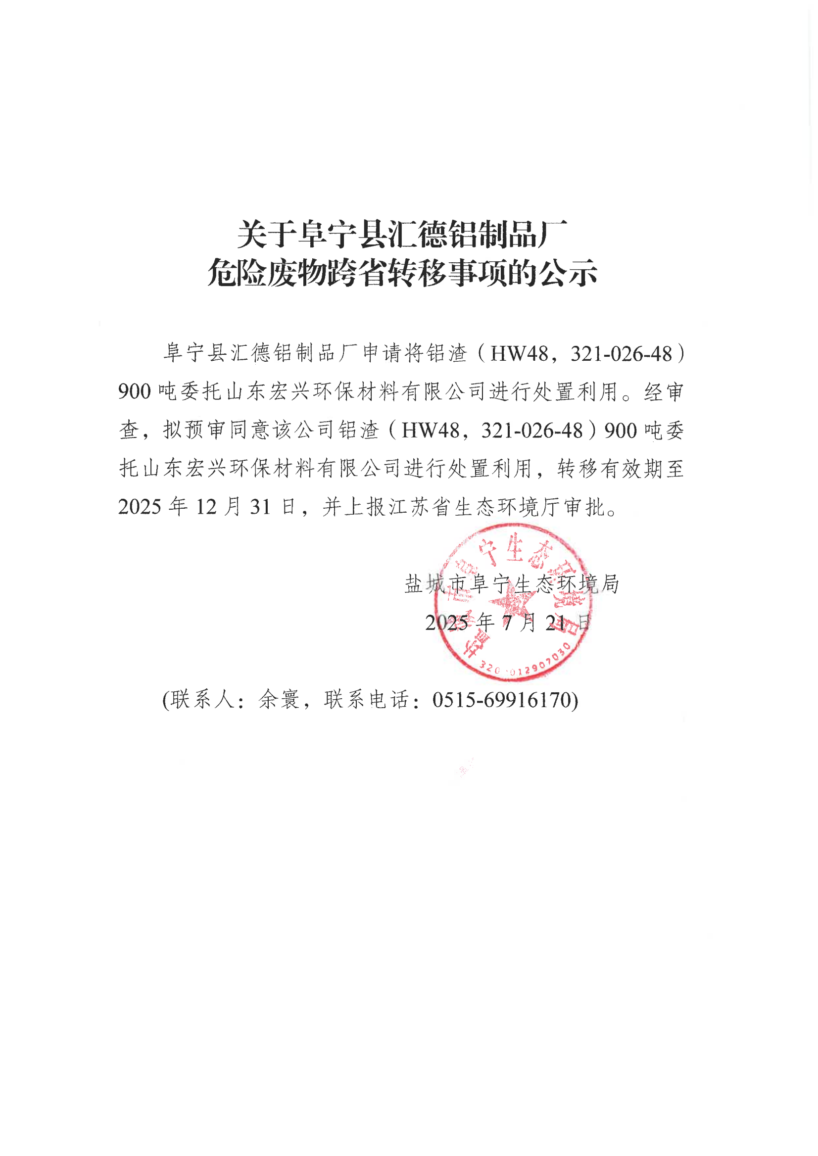 关于阜宁县汇德铝制品厂危险废物跨省转移事项的公示