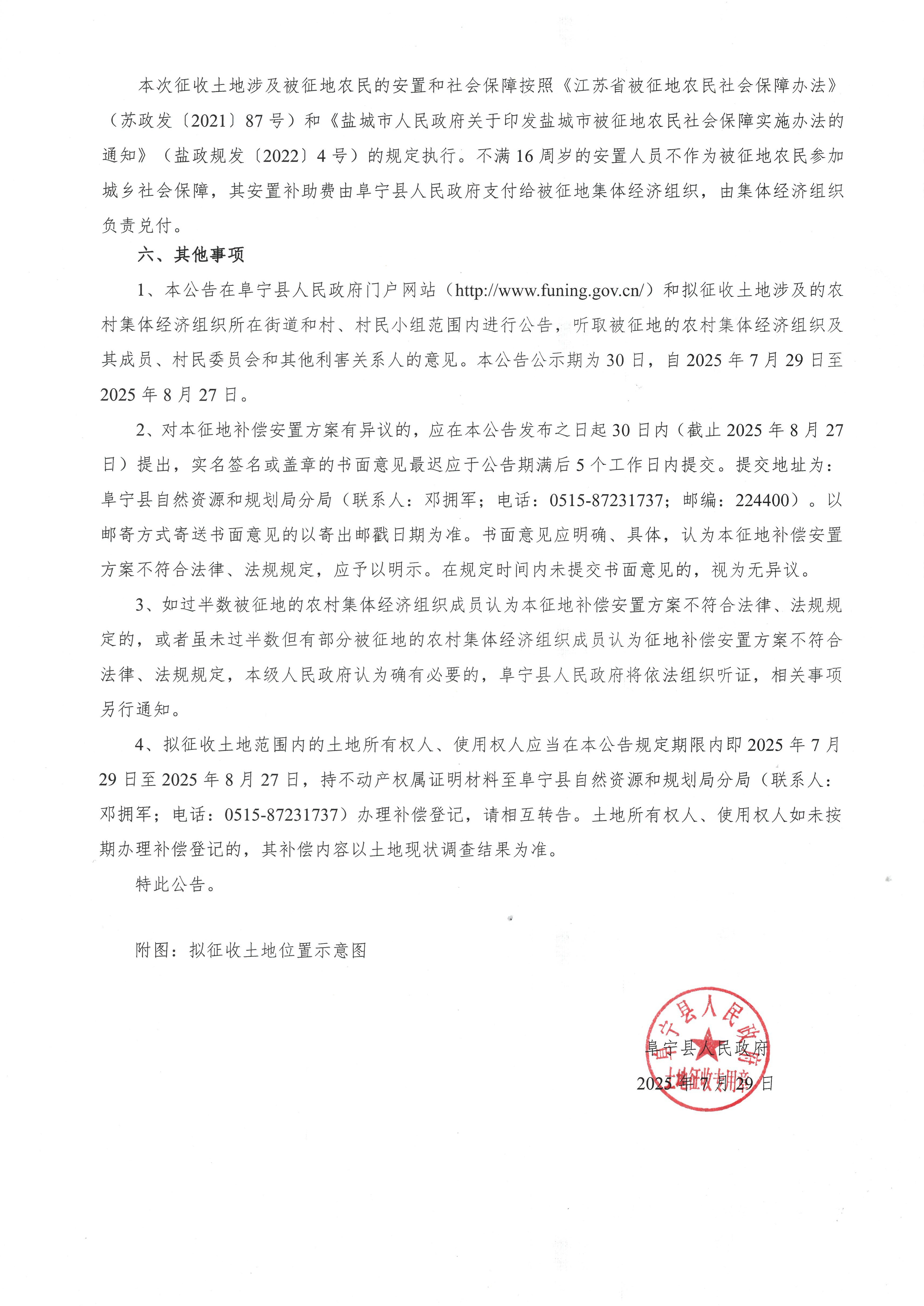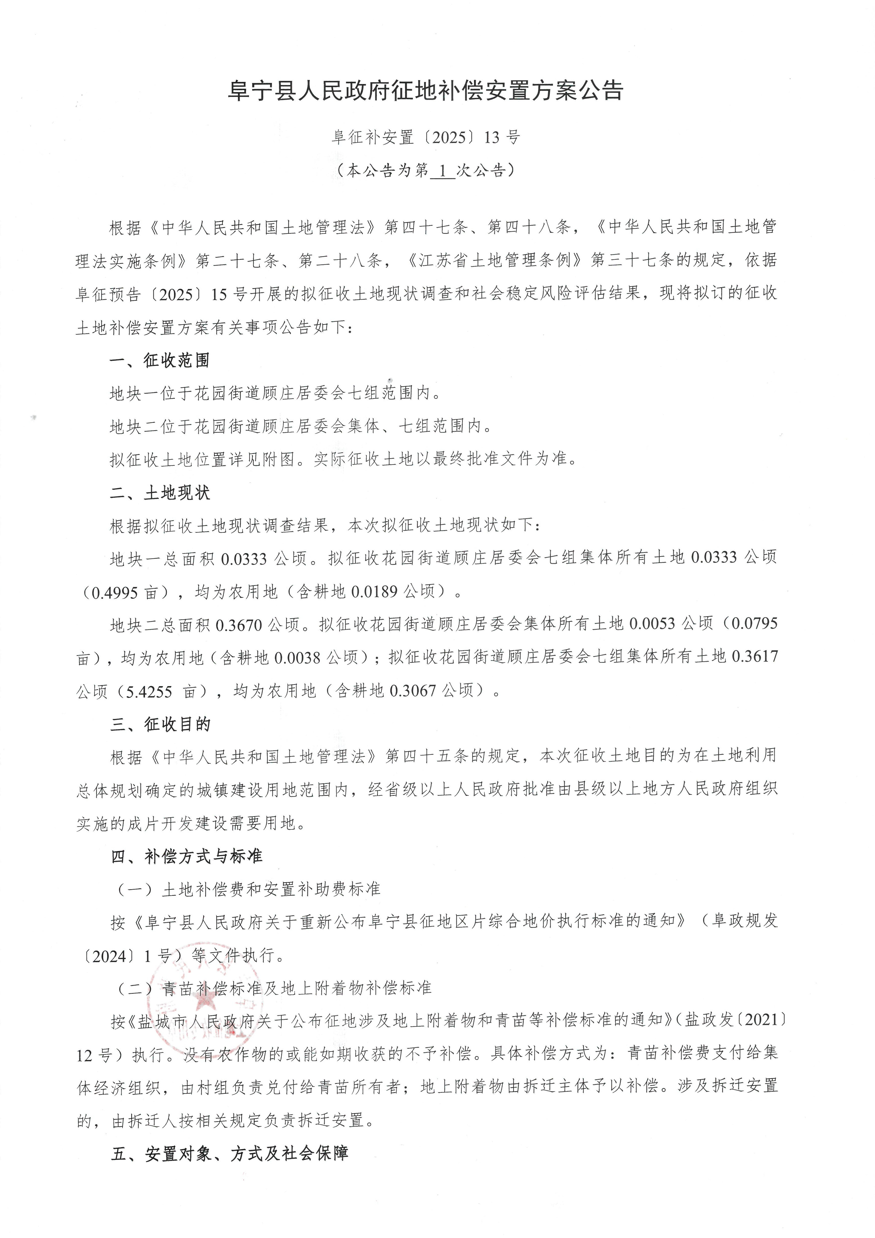 阜宁县人民政府征地补偿安置方案公告(阜征补安置〔2025〕13号)