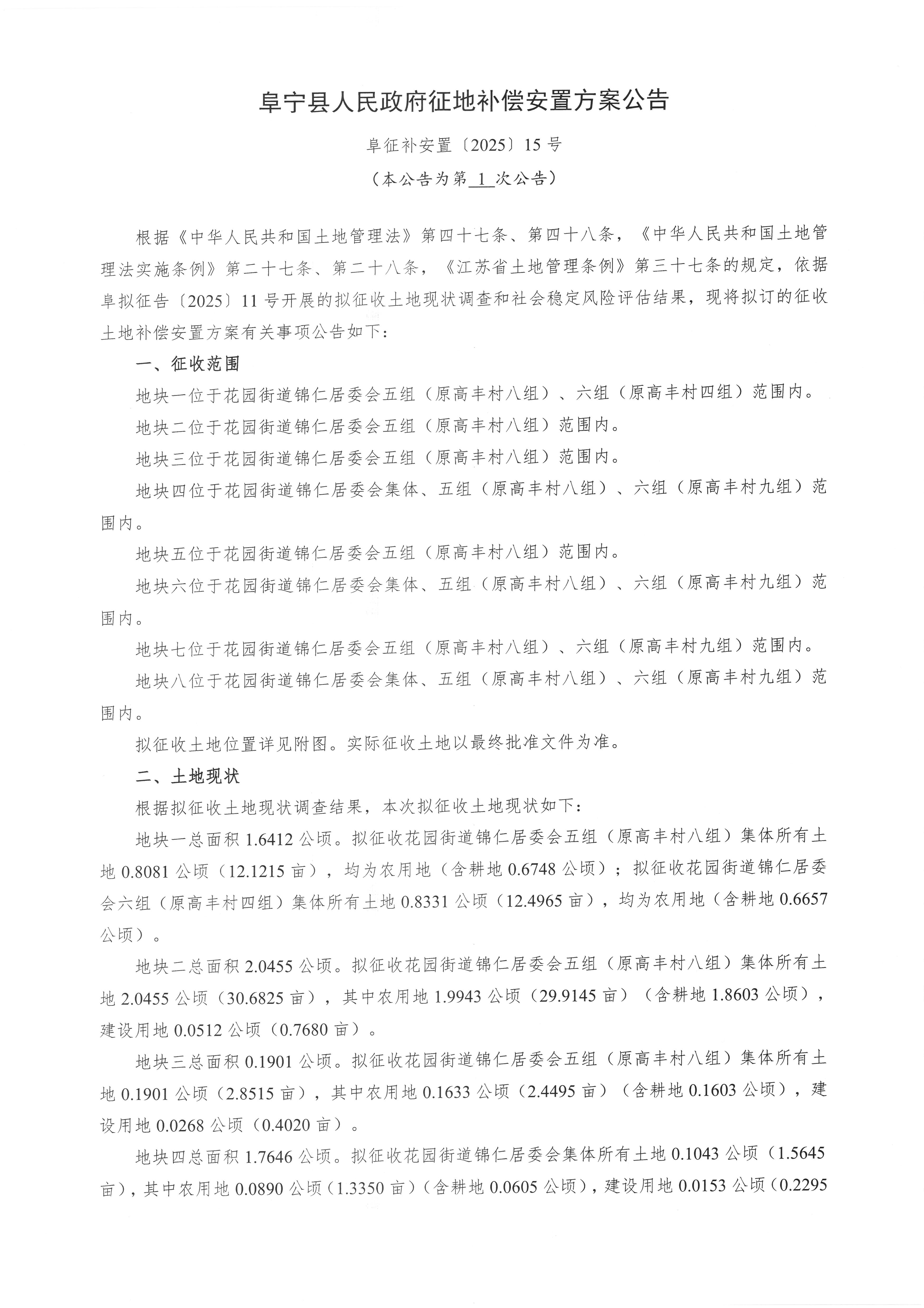 阜宁县人民政府征地补偿安置方案公告(阜征补安置〔2025〕15号)
