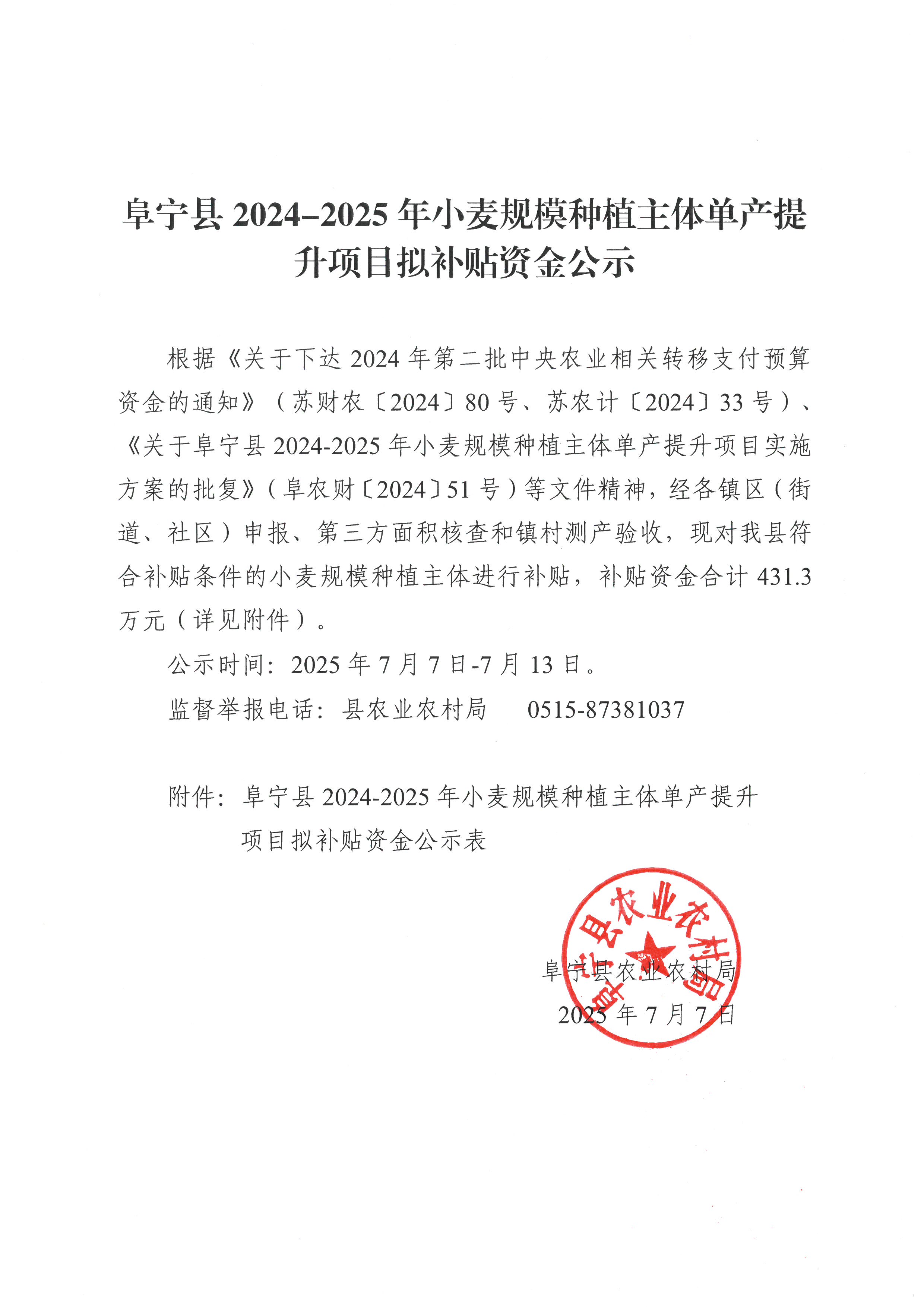 阜宁县2024-2025年小麦规模种植主体单产提升项目拟补贴资金公示