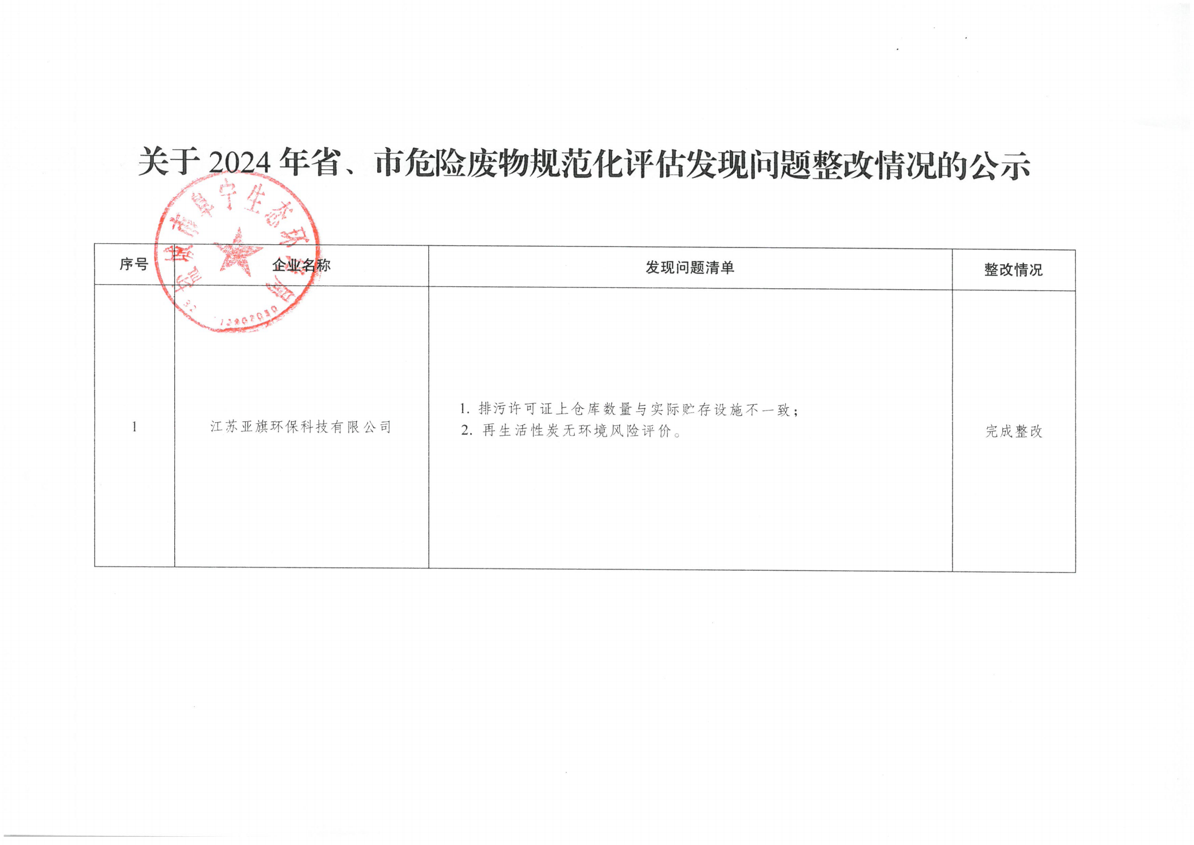 关于2024年省、市危险废物规范化评估发现问题整改情况的公示