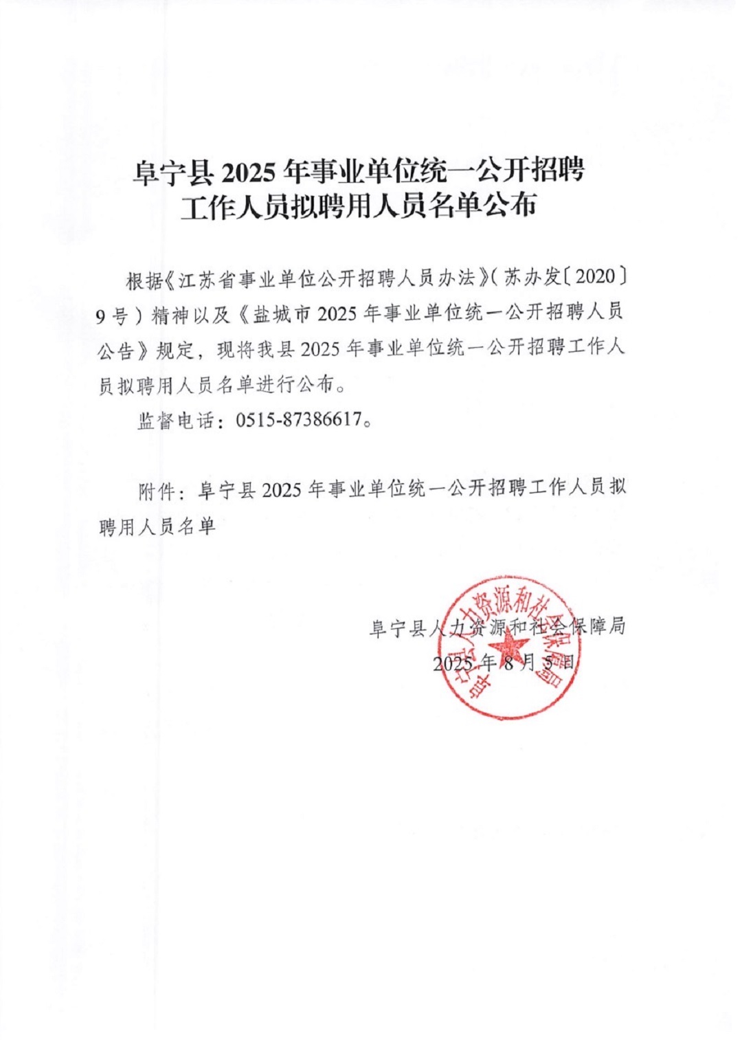 阜宁县2025年事业单位统一公开招聘工作人员拟聘用人员名单公布