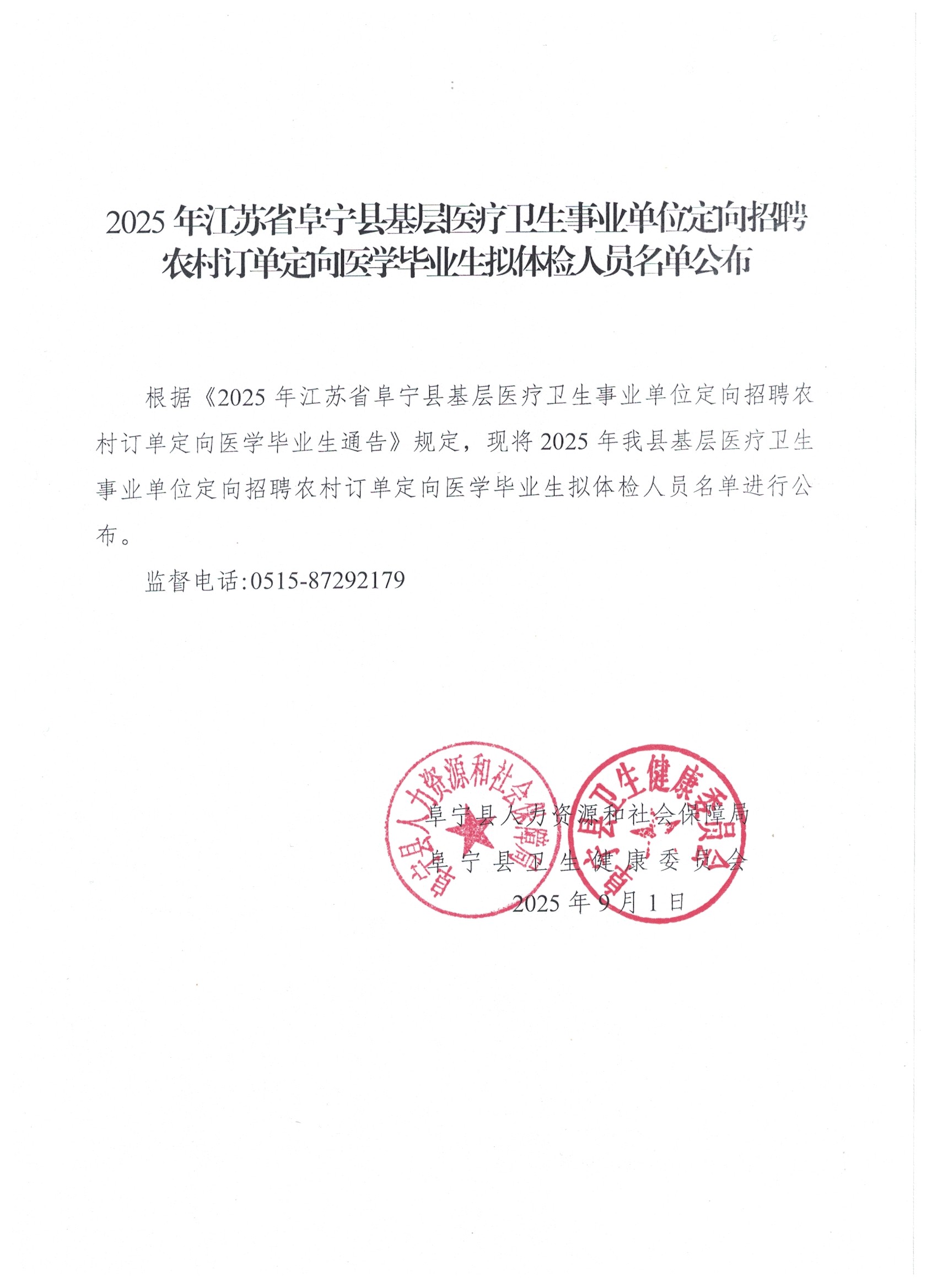 2025年阜宁县基层医疗卫生事业单位定向招聘农村订单定向医学毕业生拟体检人员名单.pdf