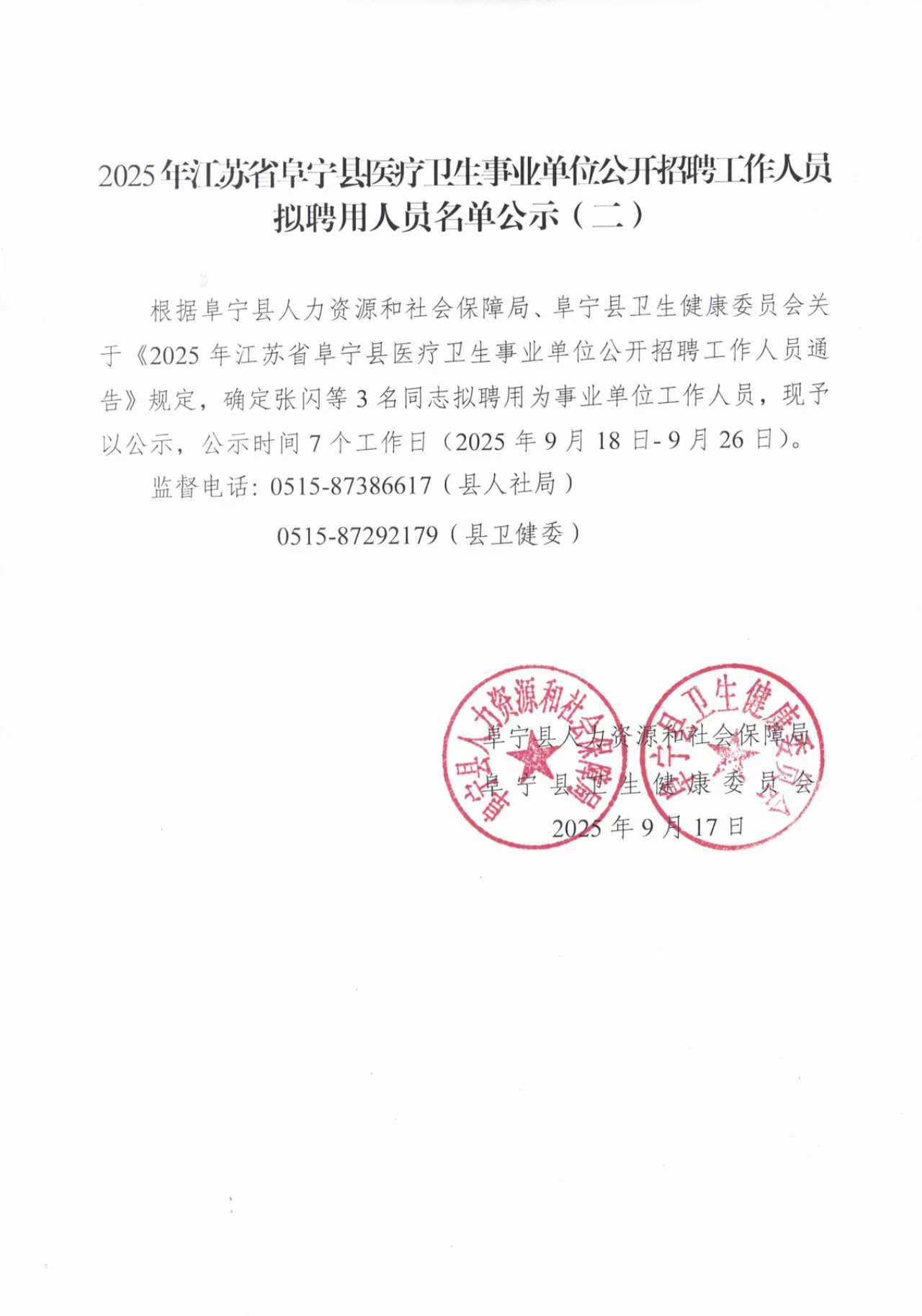 2025年江苏省阜宁县医疗卫生事业单位公开招聘工作人员拟聘用人员名单(二)