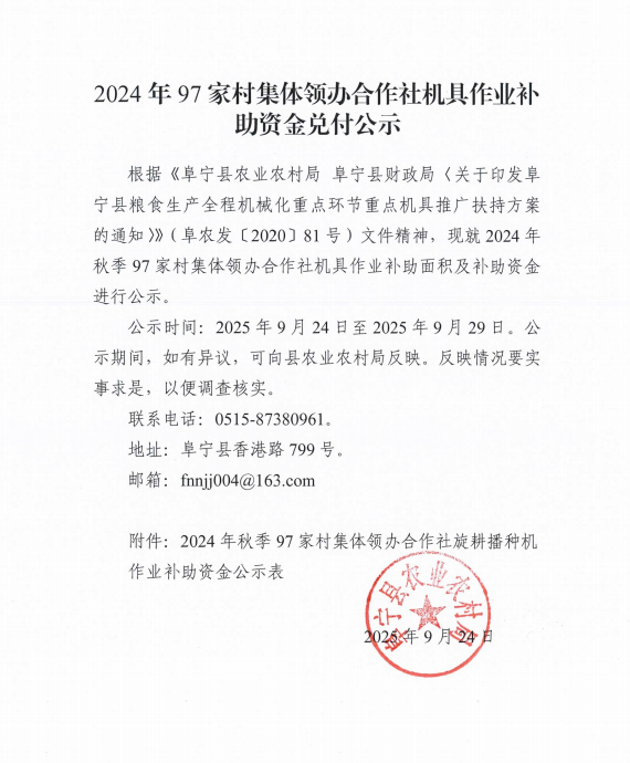 2024年97家村集体领办合作社机具作业补贴资金兑付公示