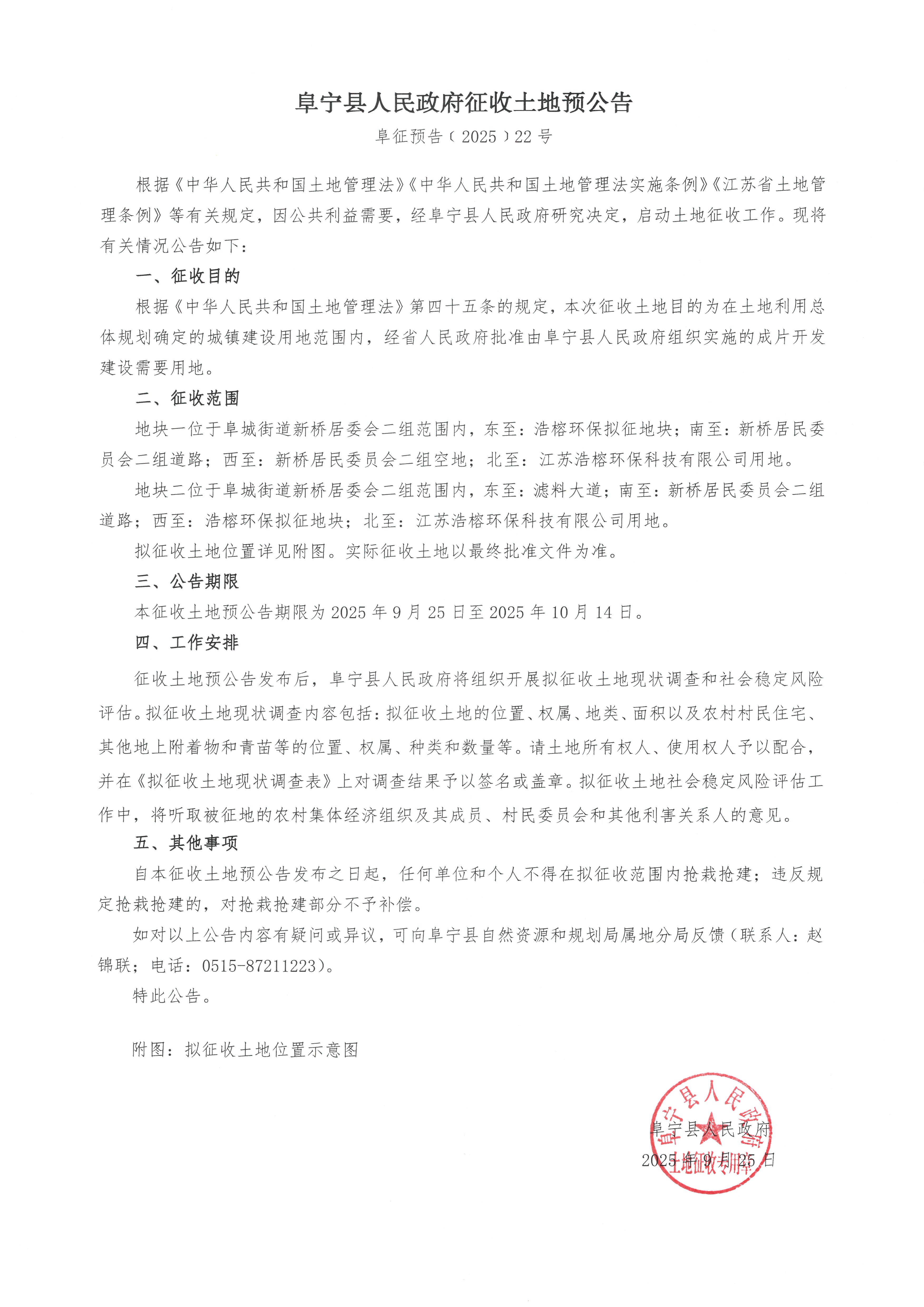 阜宁县人民政府征收土地预公告(阜征预告〔2025〕22号)