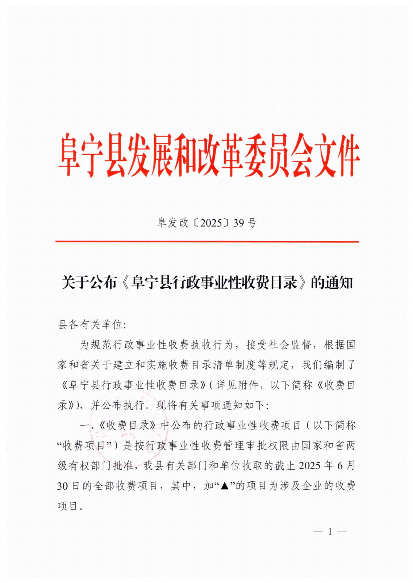 关于公布《阜宁县行政事业性收费目录》的通知
