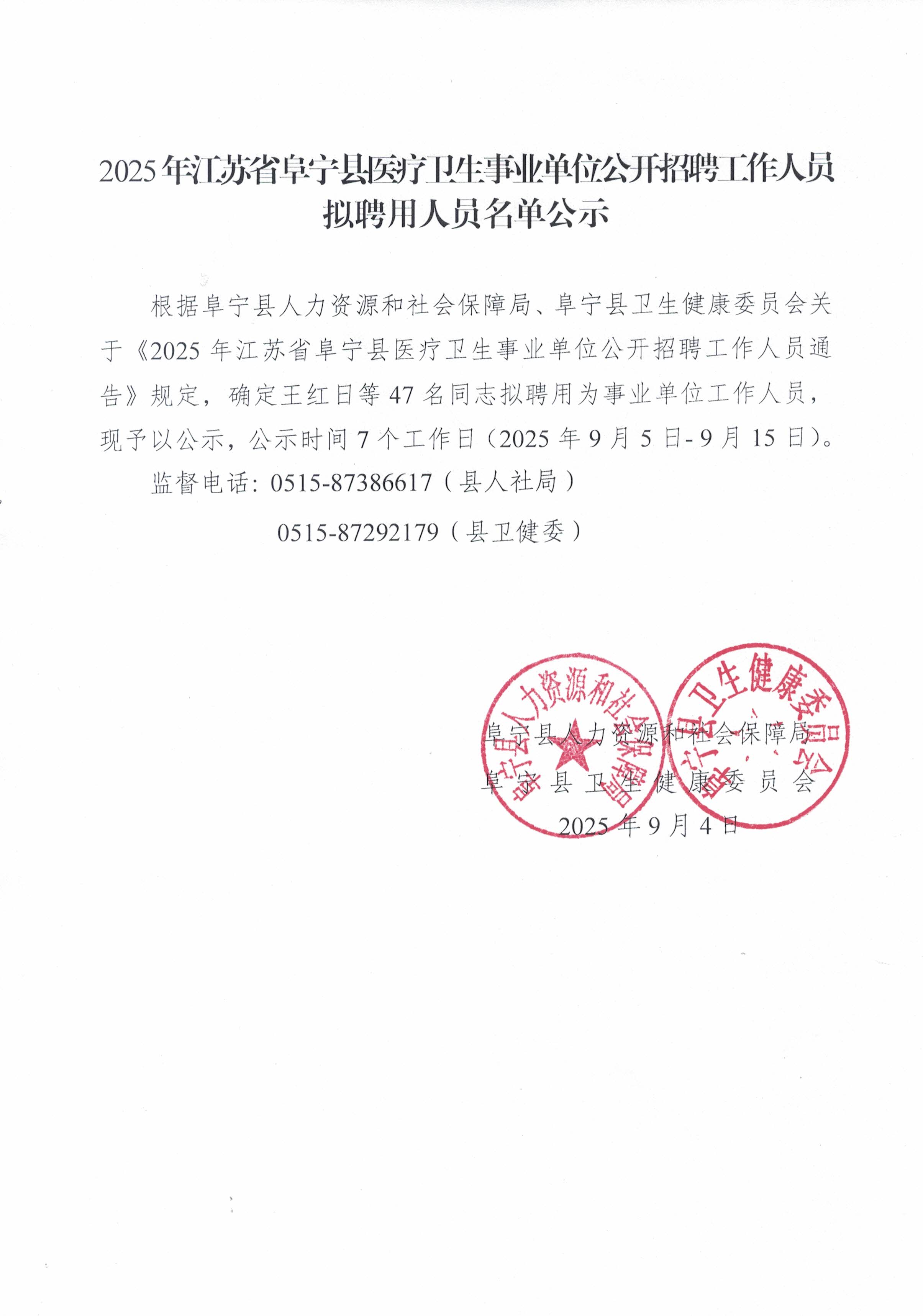 2025年江苏省阜宁县医疗卫生事业单位公开招聘工作人员拟聘用人员名单公示