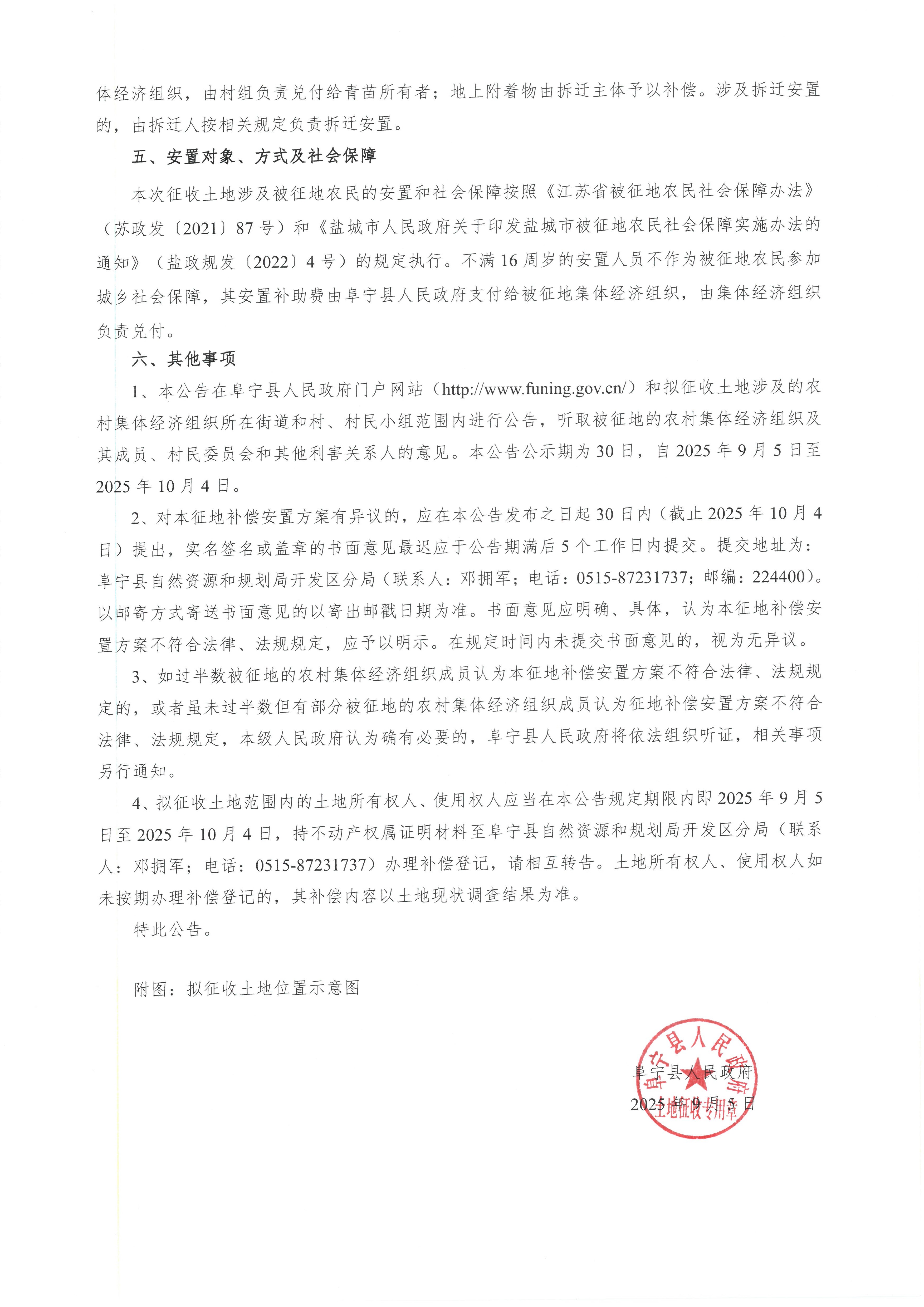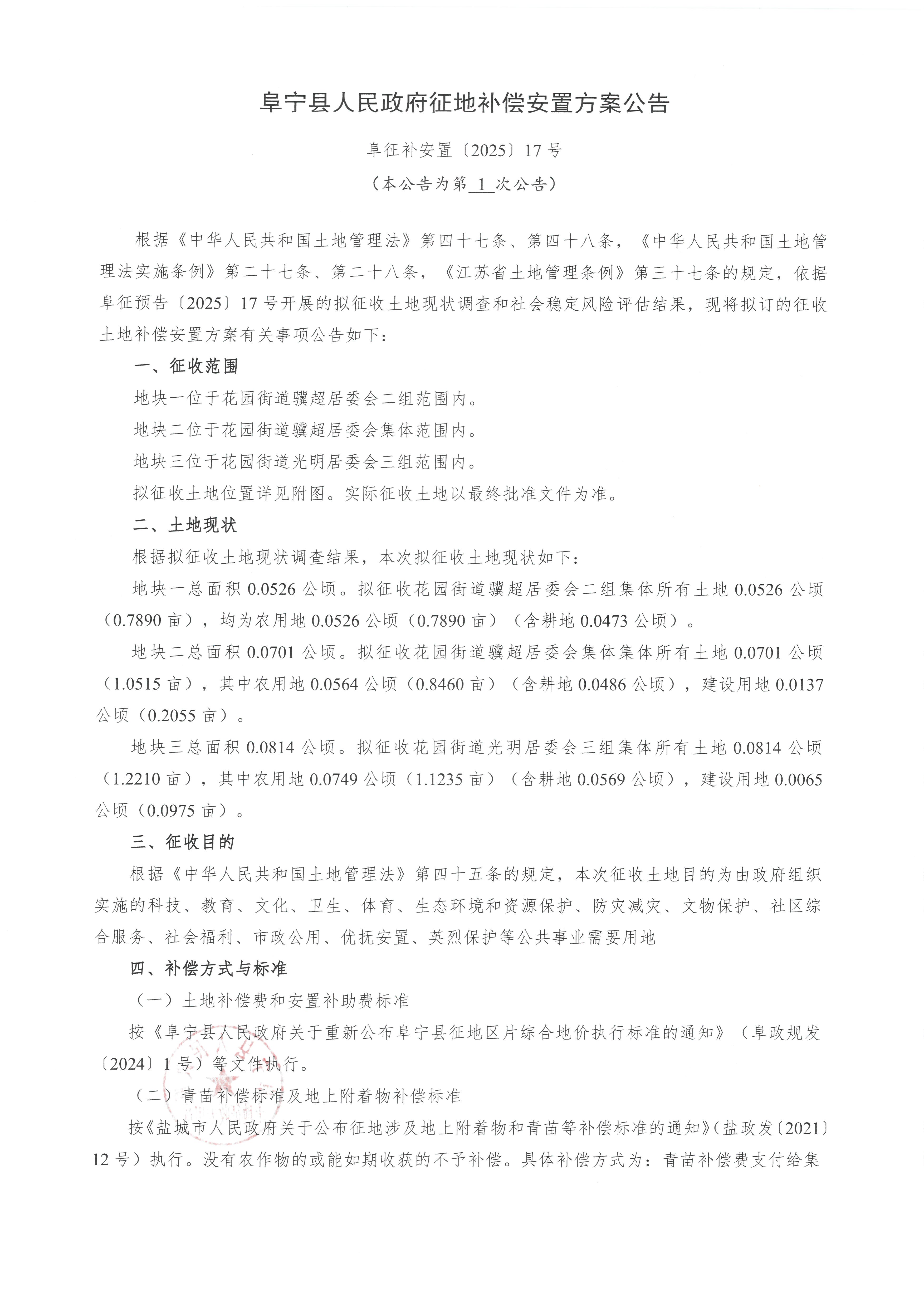 阜宁县人民政府征地补偿安置方案公告(阜征补安置〔2025〕17号)
