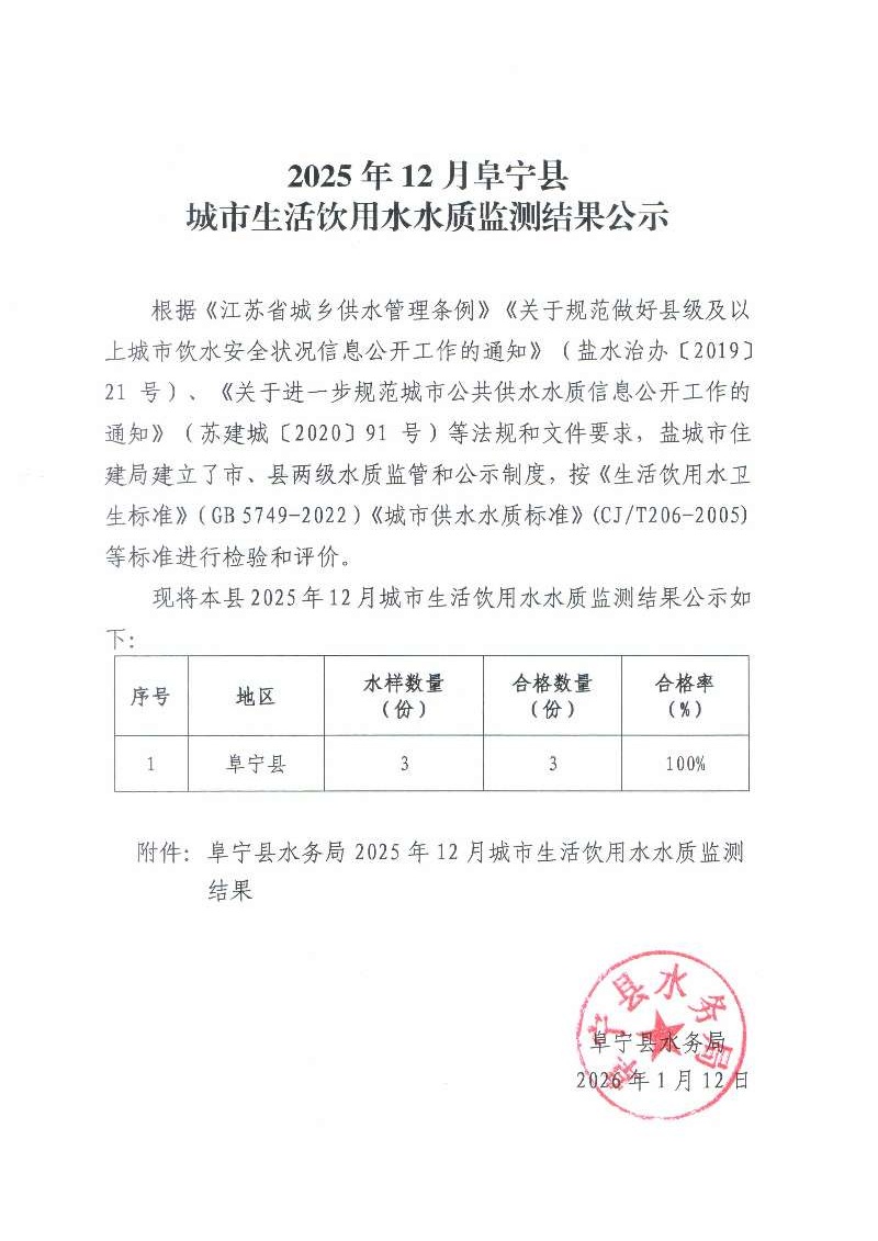 2025年12月阜宁县城市生活饮用水水质监测结果公示