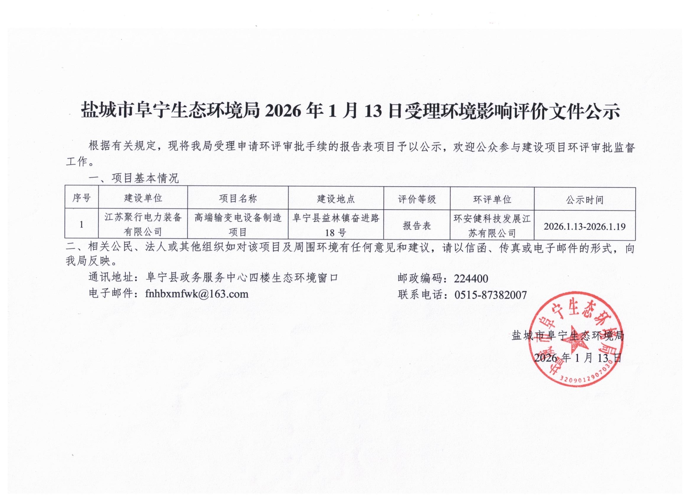 盐城市阜宁生态环境局2026年1月13日受理环境影响评价文件公示