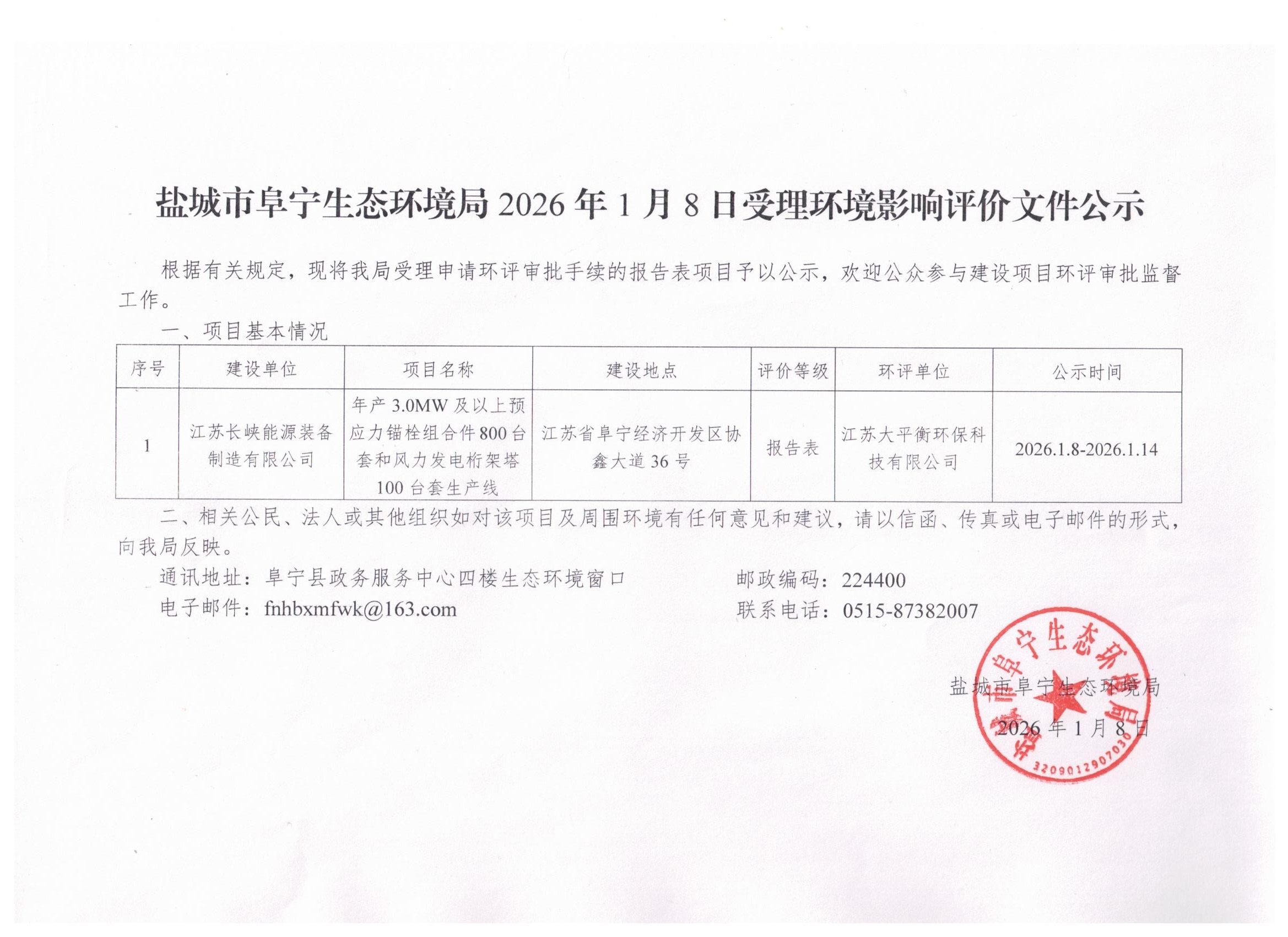 盐城市阜宁生态环境局2026年1月8日受理环境影响评价文件公示