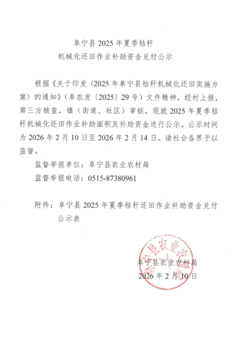 阜宁县2025年夏季秸秆机械化还田作业补助资金兑付公示