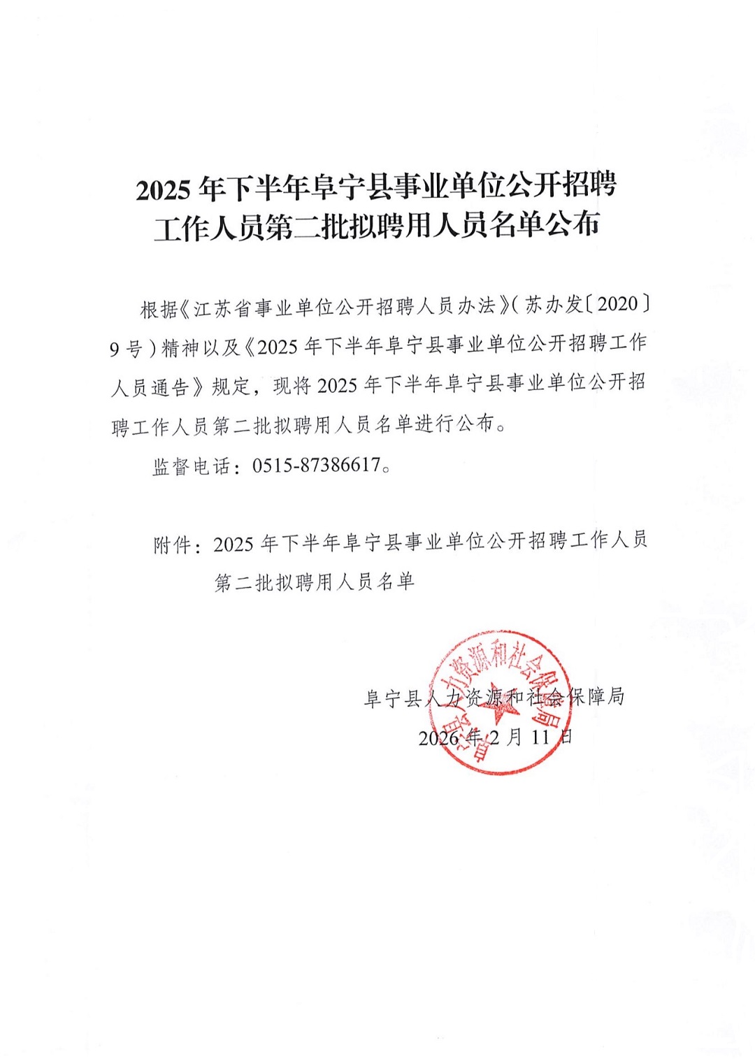 2025年下半年阜宁县事业单位公开招聘工作人员第二批拟聘用人员名单公布