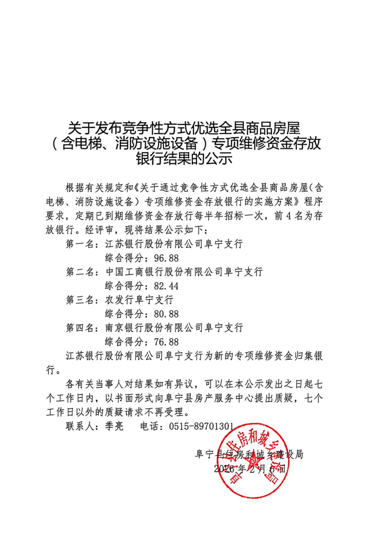 关于发布竞争性方式优选全县商品房屋(含电梯、消防设施设备)专项维修资金存放银行结果的公示