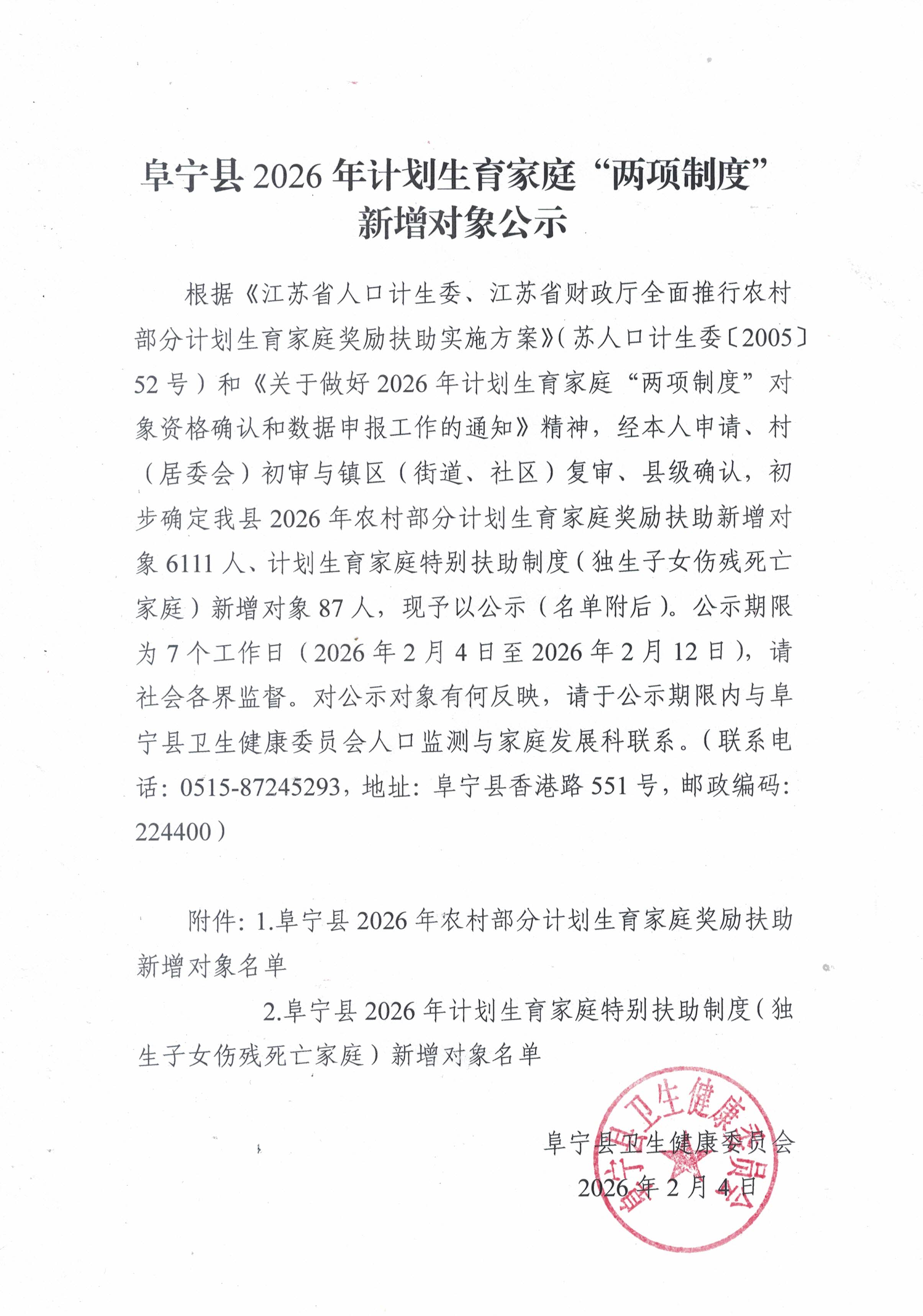 阜宁县2026年农村部分计划生育家庭奖励扶助新增对象名单.docx阜宁县2026年计划生育家庭特别扶助制度(独生子女伤残死亡家庭)新增对象名单.docx