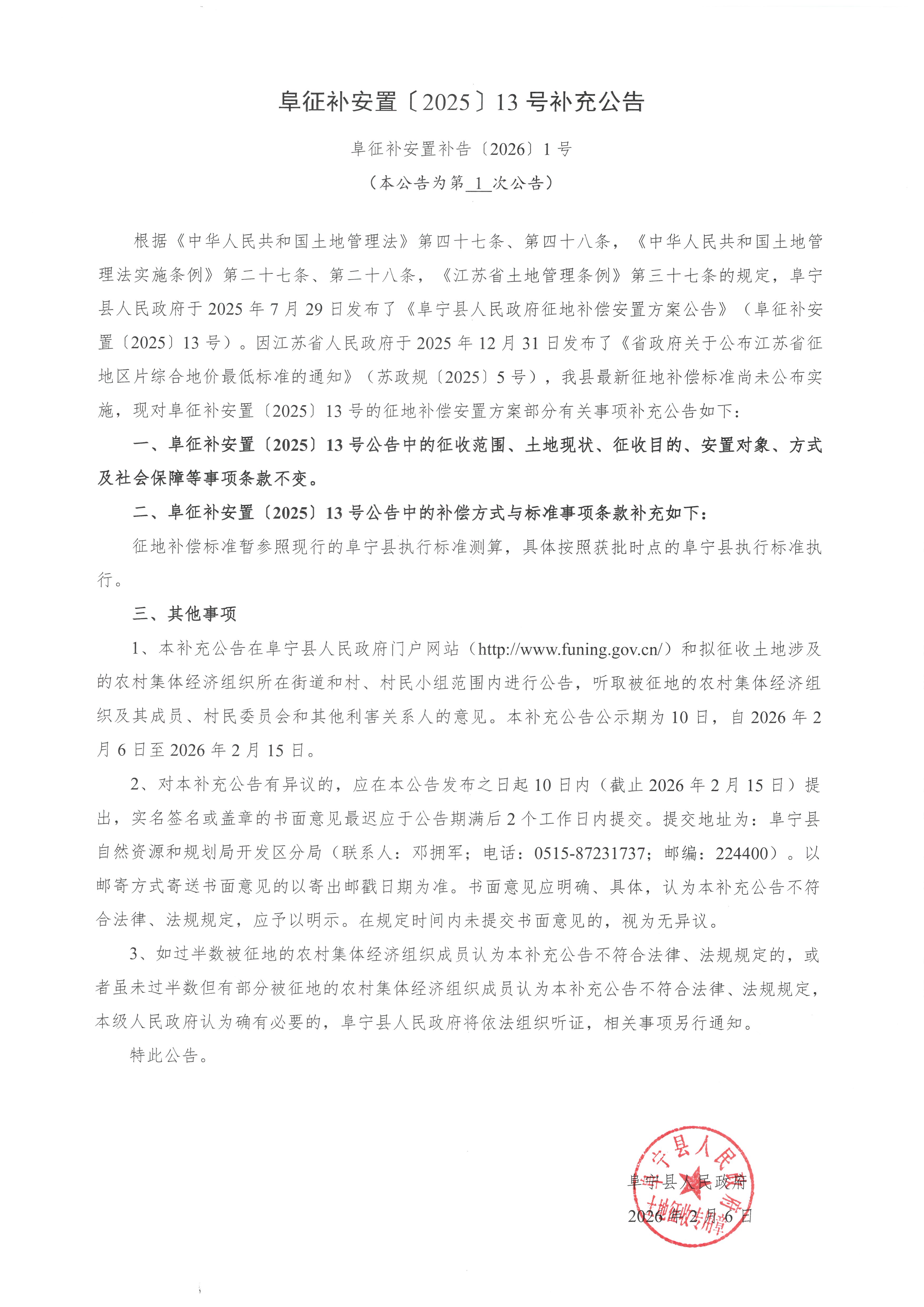 阜征补安置〔2025〕13号补充公告(阜征补安置补告〔2026〕1号)
