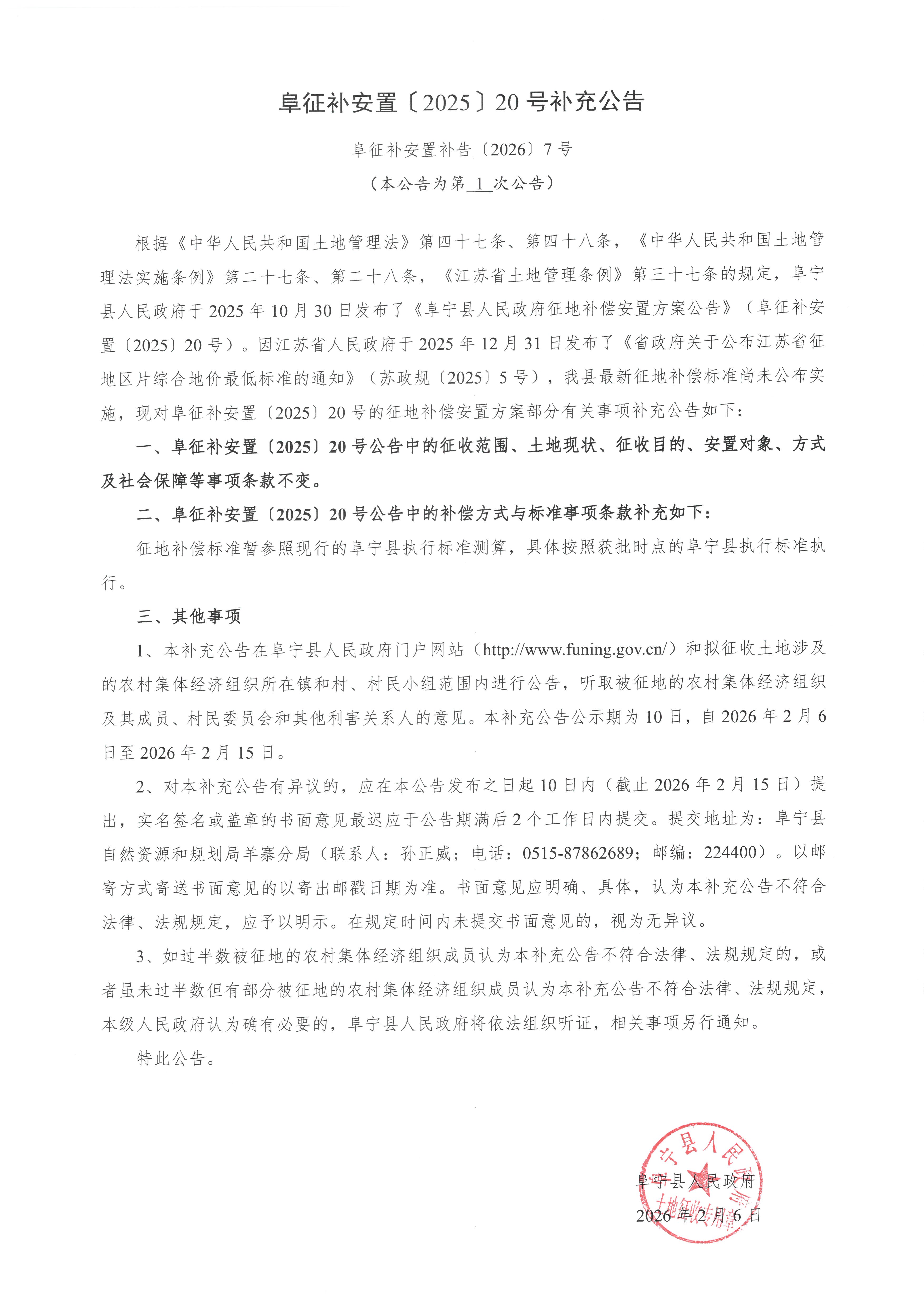 阜征补安置〔2025〕20号补充公告(阜征补安置补告〔2026〕7号)