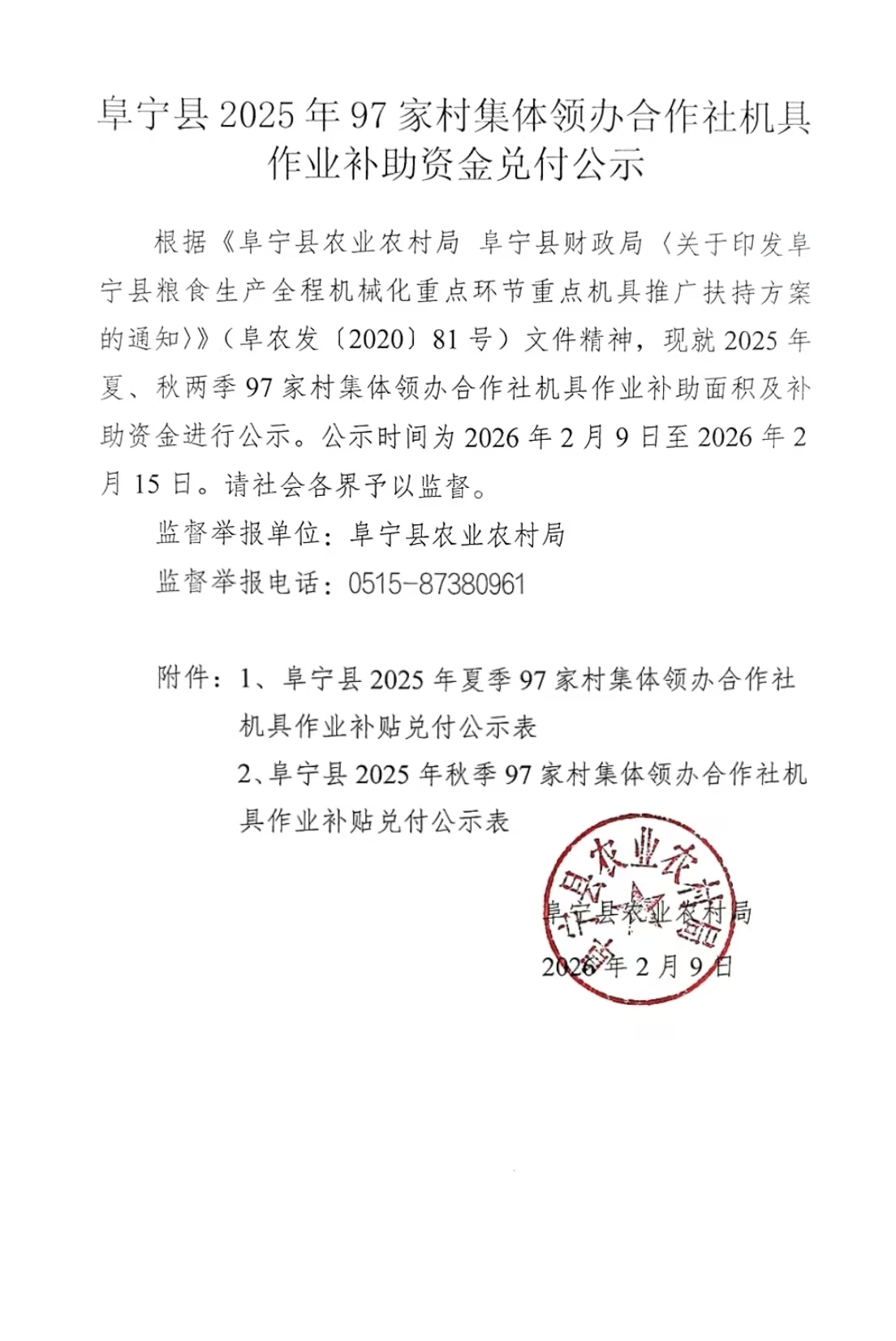 阜宁县2025年97家村集体领办合作社机具作业补助资金兑付公示