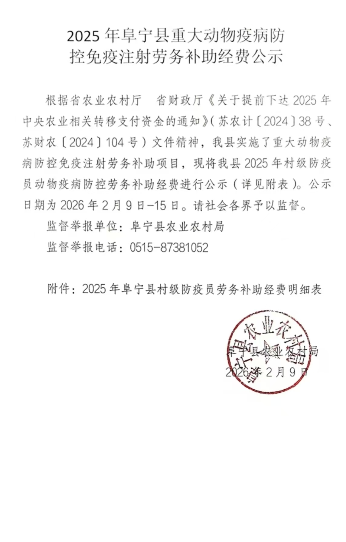 2025年阜宁县重大动物疫病防控免疫注射劳务补助经费公示
