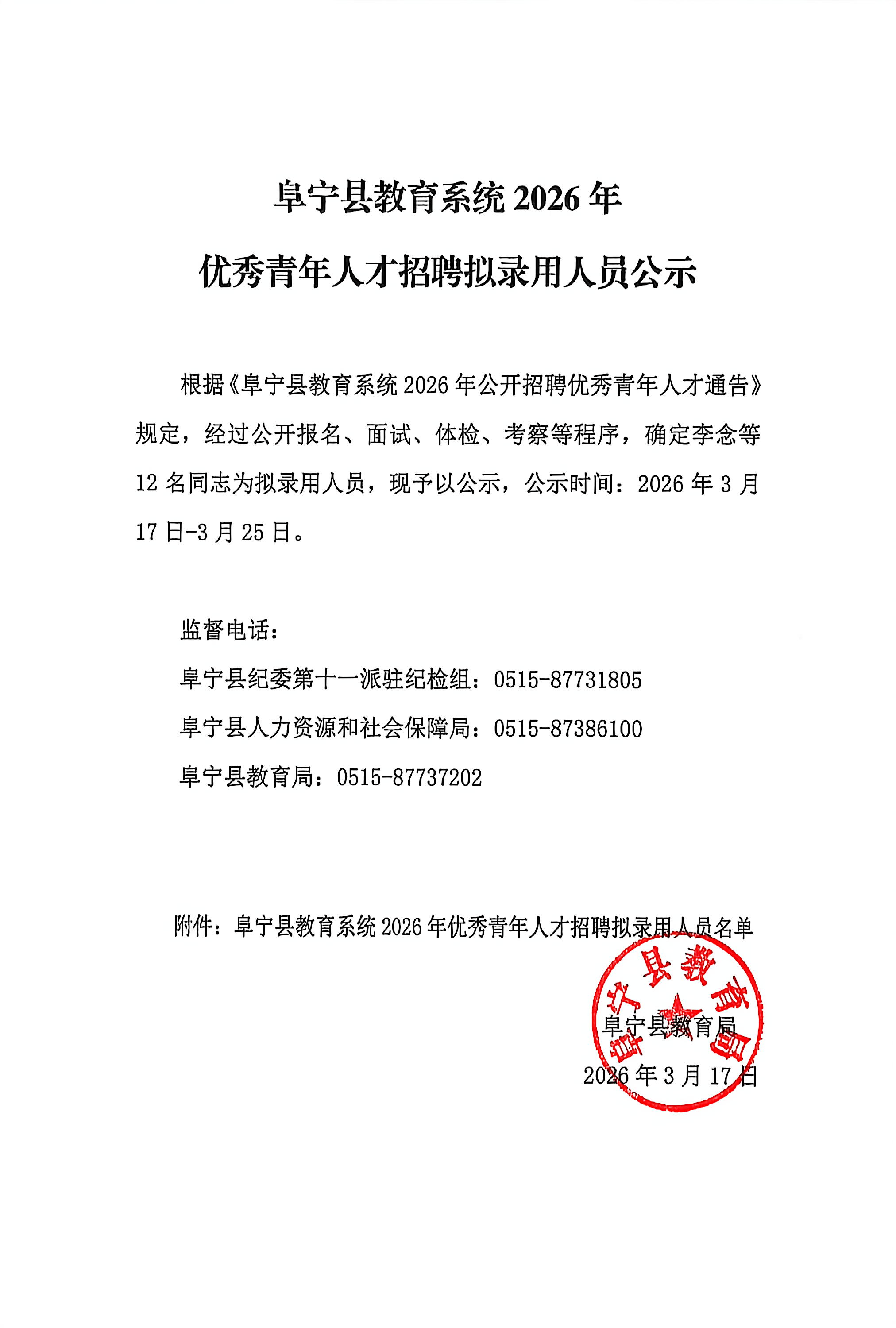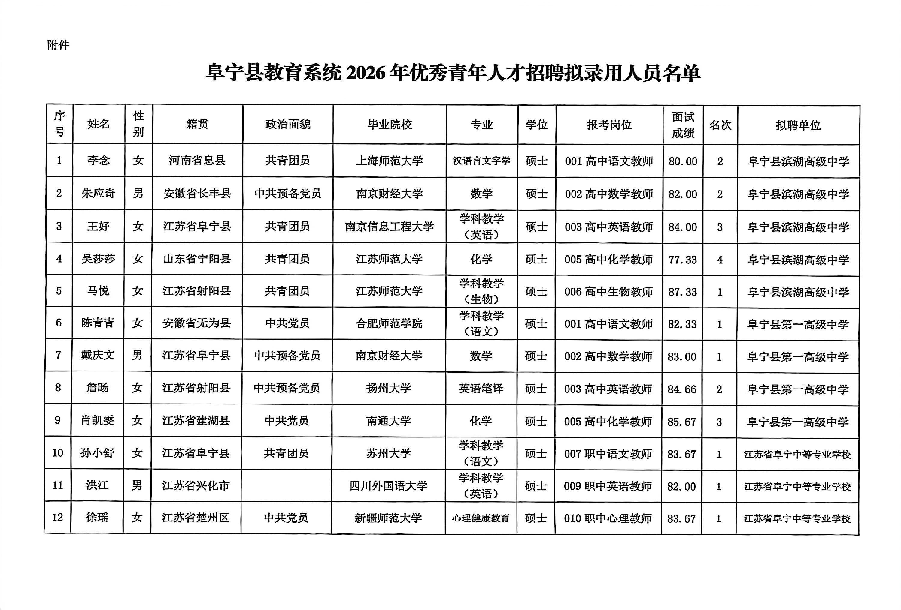 阜宁县教育系统2026年优秀青年人才招聘拟录用人员公示