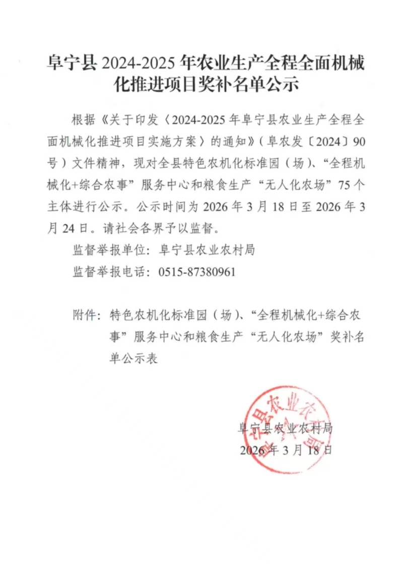 阜宁县2024-2025年农业生产全程全面机械化推进项目奖补名单公示