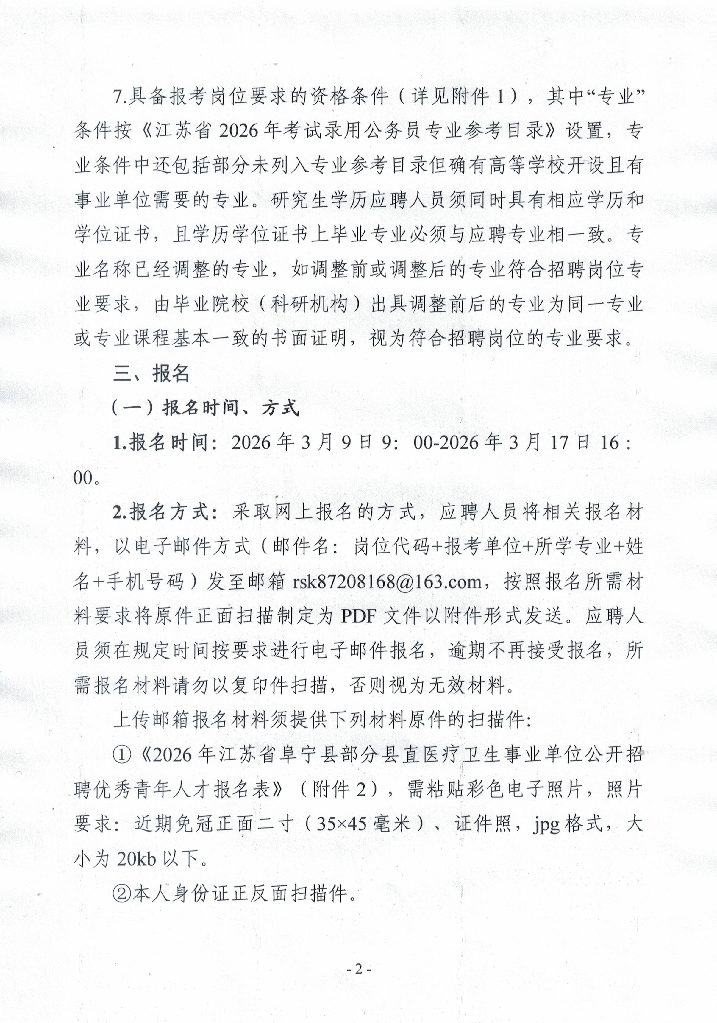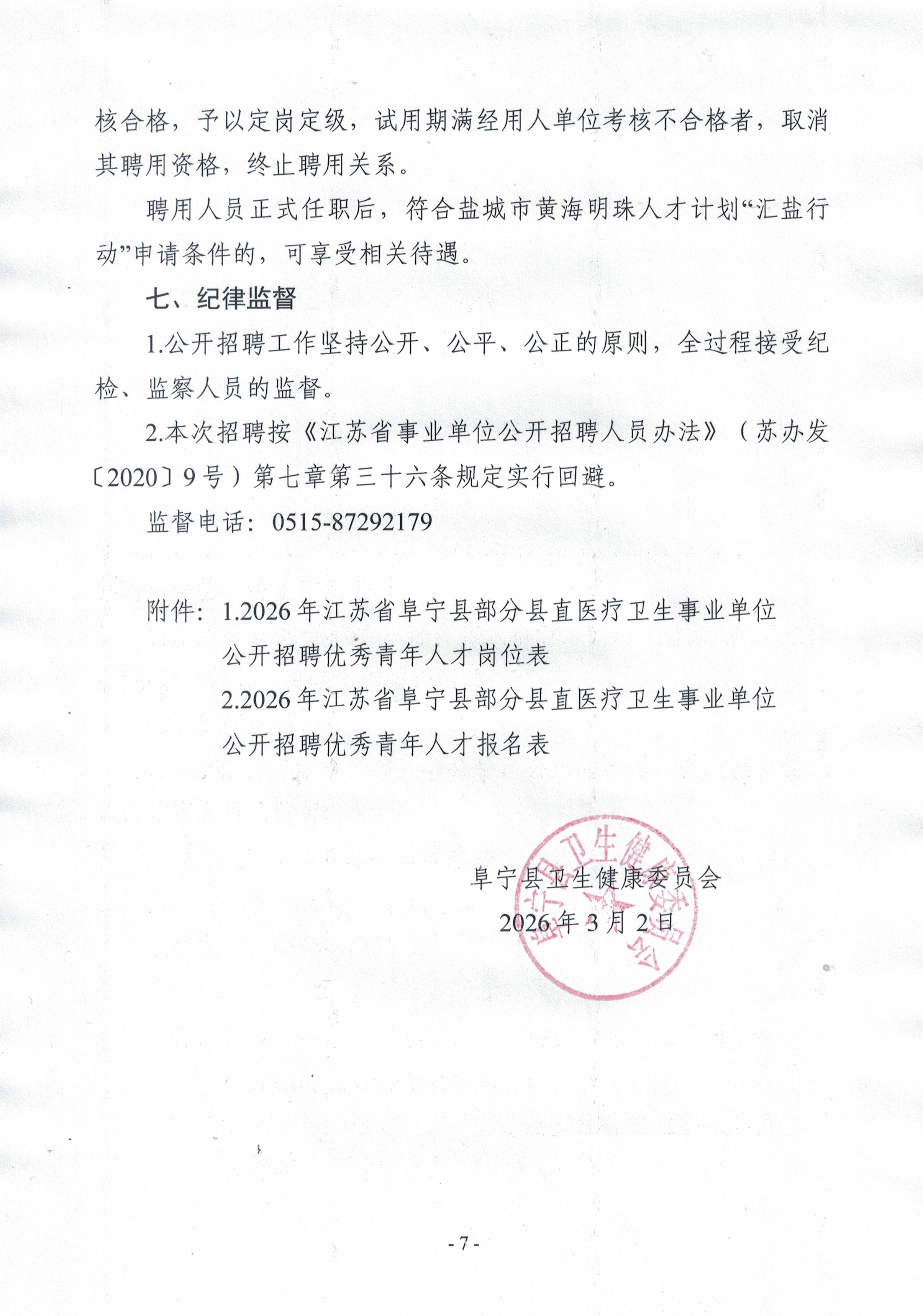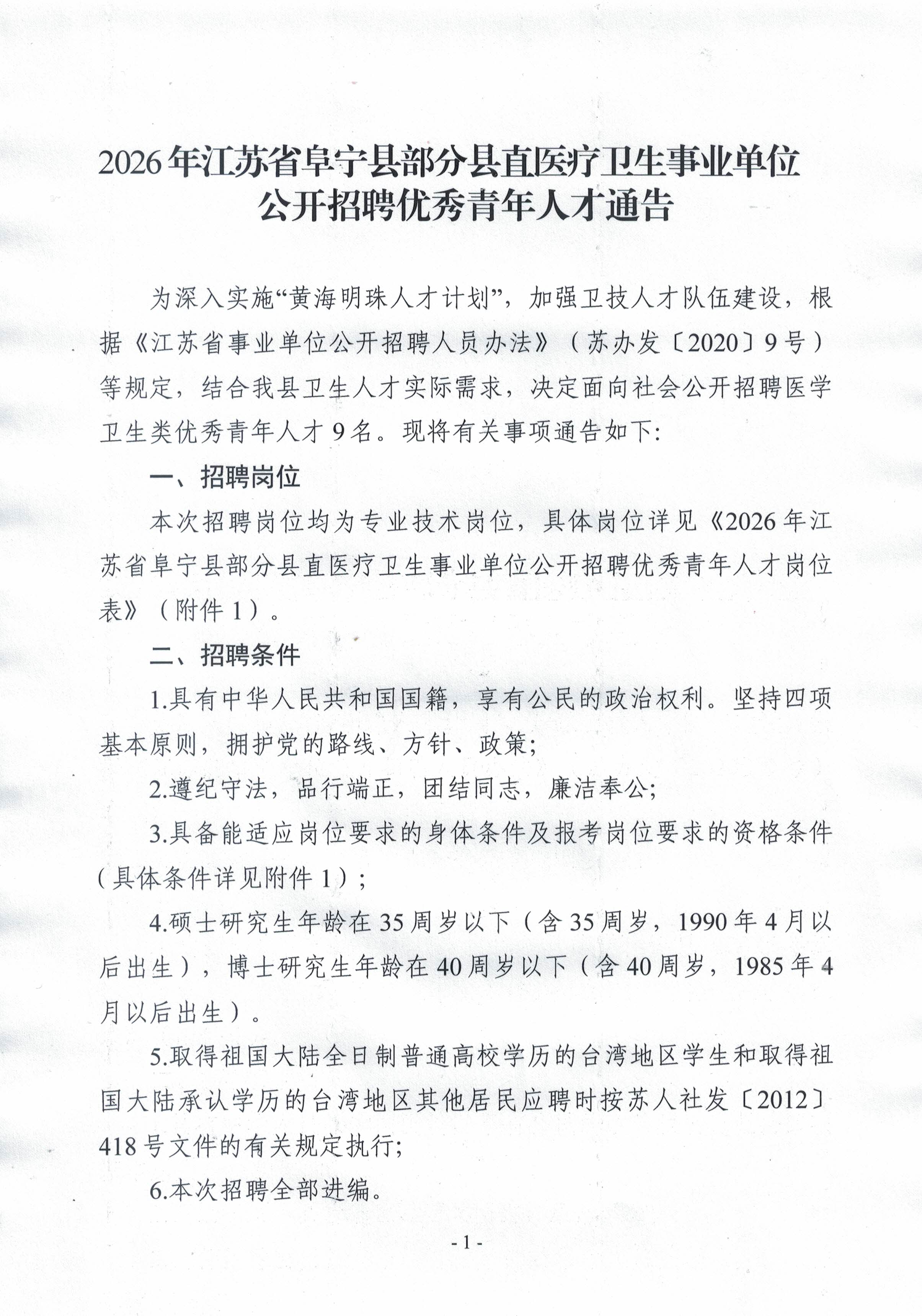 附件1:2026年江苏省阜宁县部分县直医疗卫生事业单位公开招聘优秀青年人才岗位表.xls附件2:2026年江苏省阜宁县部分县直医疗卫生事业单位公开招聘优秀青年人才报名表.doc