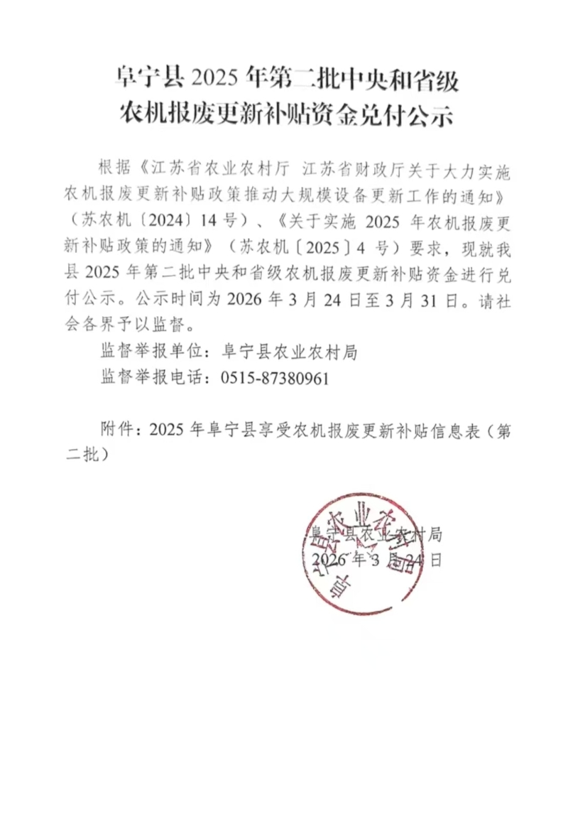阜宁县2025年第二批中央和省级农机报废更新补贴资金兑付公示