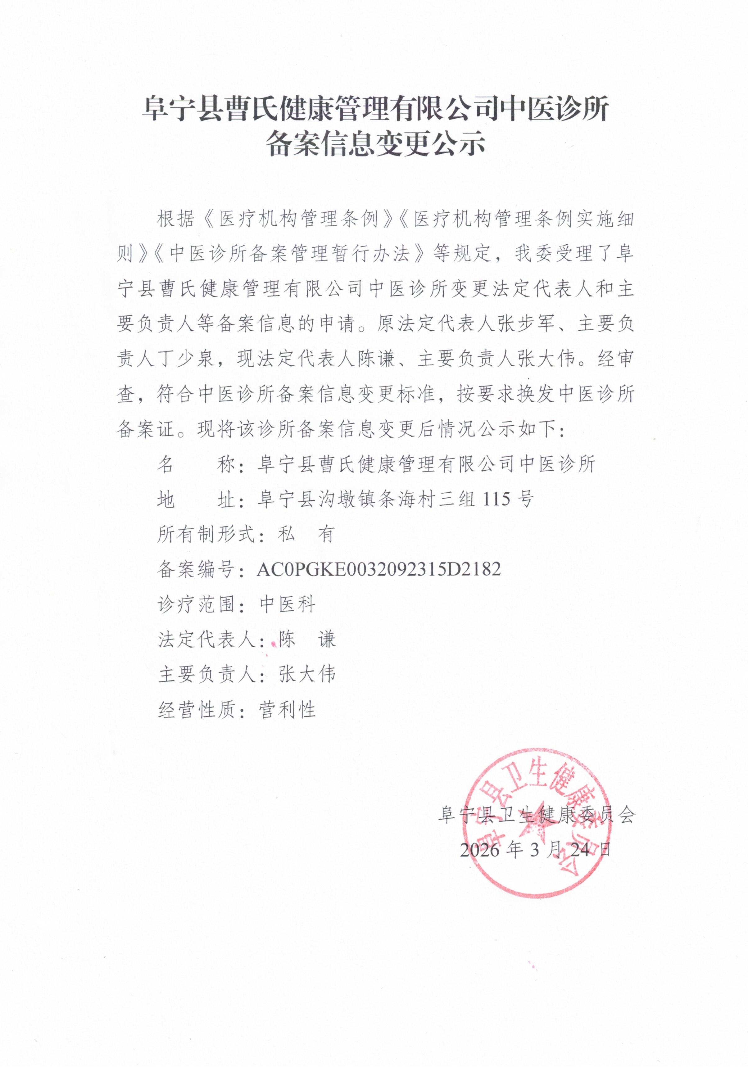 阜宁县曹氏健康管理有限公司中医诊所备案信息变更公示