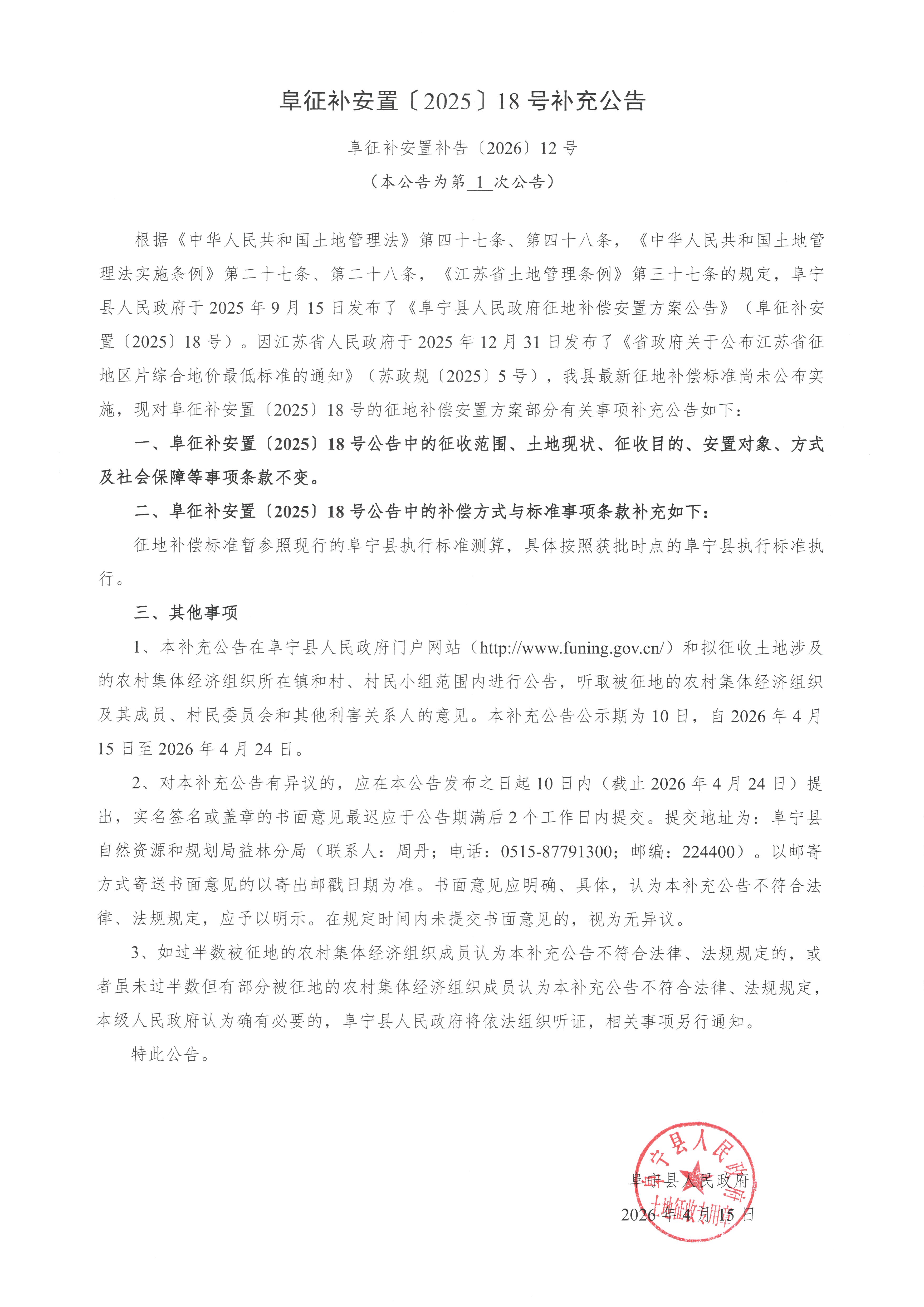阜征补安置〔2025〕18号补充公告(阜征补安置补告〔2026〕12号)